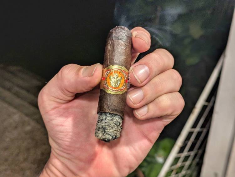 En el último tercio el Oscuro se hace más picante, pero el tiro sigue siendo una pesadilla. He masajeado el cigarro bastante, pero la parte más rígida se siente alrededor de la anilla y no importa cuántas puñaladas le he metido, el tiro sigue siendo casi imposible. El sabor de chocolate desapareció por el punto medio del cigarro y ha sido el de cuero y una cierta nota agria lo que se ha mantenido más en el cigarro, con un retrogusto de nueces y madera. Luego de dos horas (y yo mismo me impresioné de durar tanto), el Oscuro de El Rey del Mundo se apagó solo y no quise reencenderlo, aunque ya le quedaba poco de todos modos.