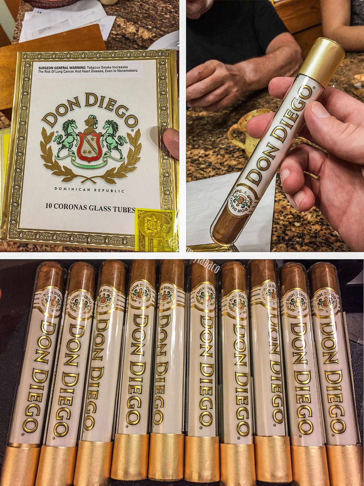 Hace un poco más de un año, un amigo (que no sabe mucho de tabacos) viajó a República Dominicana. Regresó con 3 cajas de tabacos, una de «Cohiba» y otra de «Montecristo» muy, pero muy falsos, y una de estos Don Diego Coronas, diciendo que por el nombre deben ser muy buenos. No podía negarlo, seguramente tenía razón, pero no estaría de más una investigación. Don Diego es una marca dominicana de Altadis USA, y son puros reconocidos (aunque no por mí) por ser consistentes en su suavidad. El ingrediente principal de este puro es su capa Connecticut shade, el capote es Sumatra dominicano y la tripa es una combinación de tabacos dominicanos y brasileños.