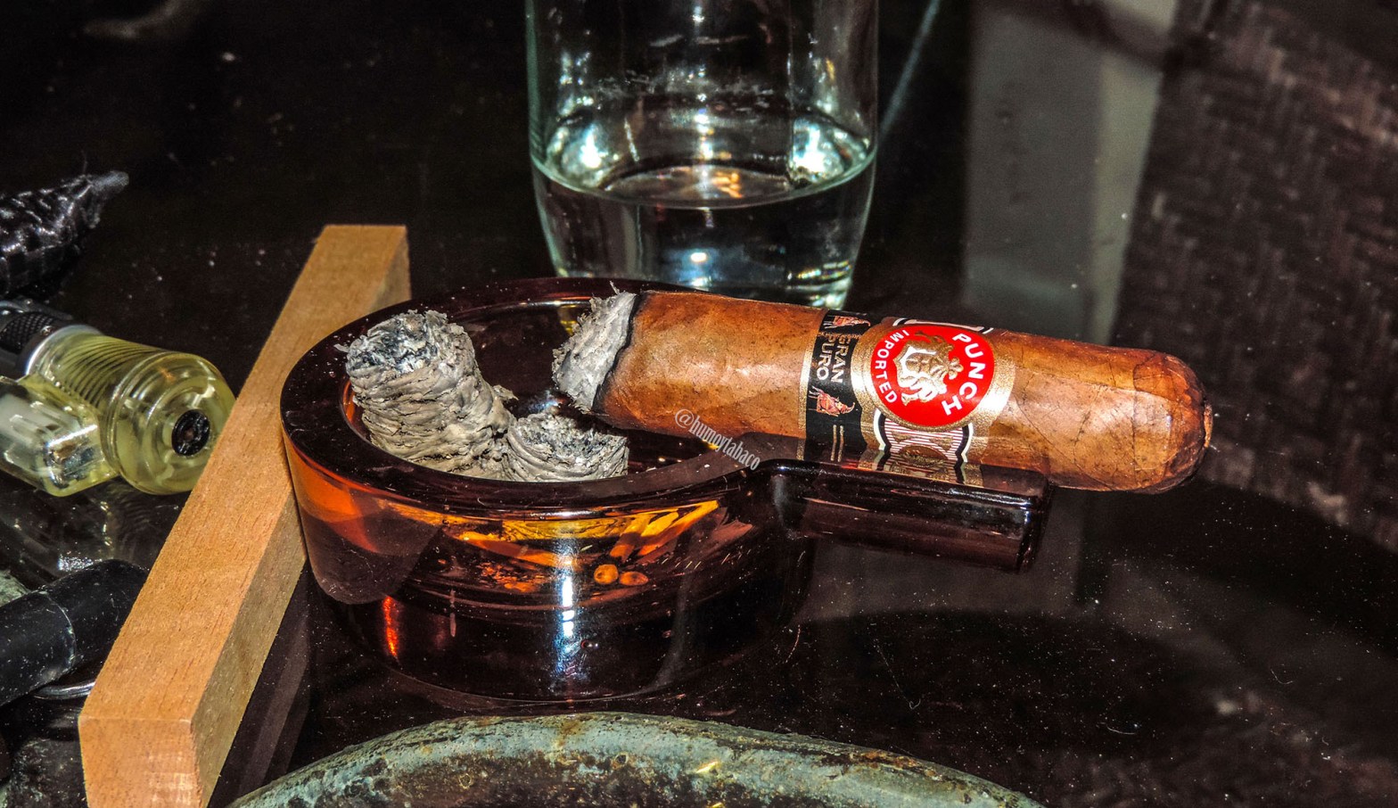 Desde la primera calada el tiro es muy bueno, humo abundante y denso, cargado de sabor… incluso si ese sabor no es necesariamente variado. Los sabores principales son de madera y clavo, pero no es un sabor rico tampoco, sino uno que se siente en el final, y un final bastante corto que tiene. El puro quema relativamente rápido, o al menos más rápido de lo que esperaba dado su tamaño y peso. La picada la hice con un punch (tenía que hacerlo, ¿no?) y ese paso de humo sigue siendo abundante incluso luego de las primeras caladas, al punto que el humo sale por ambos extremos.