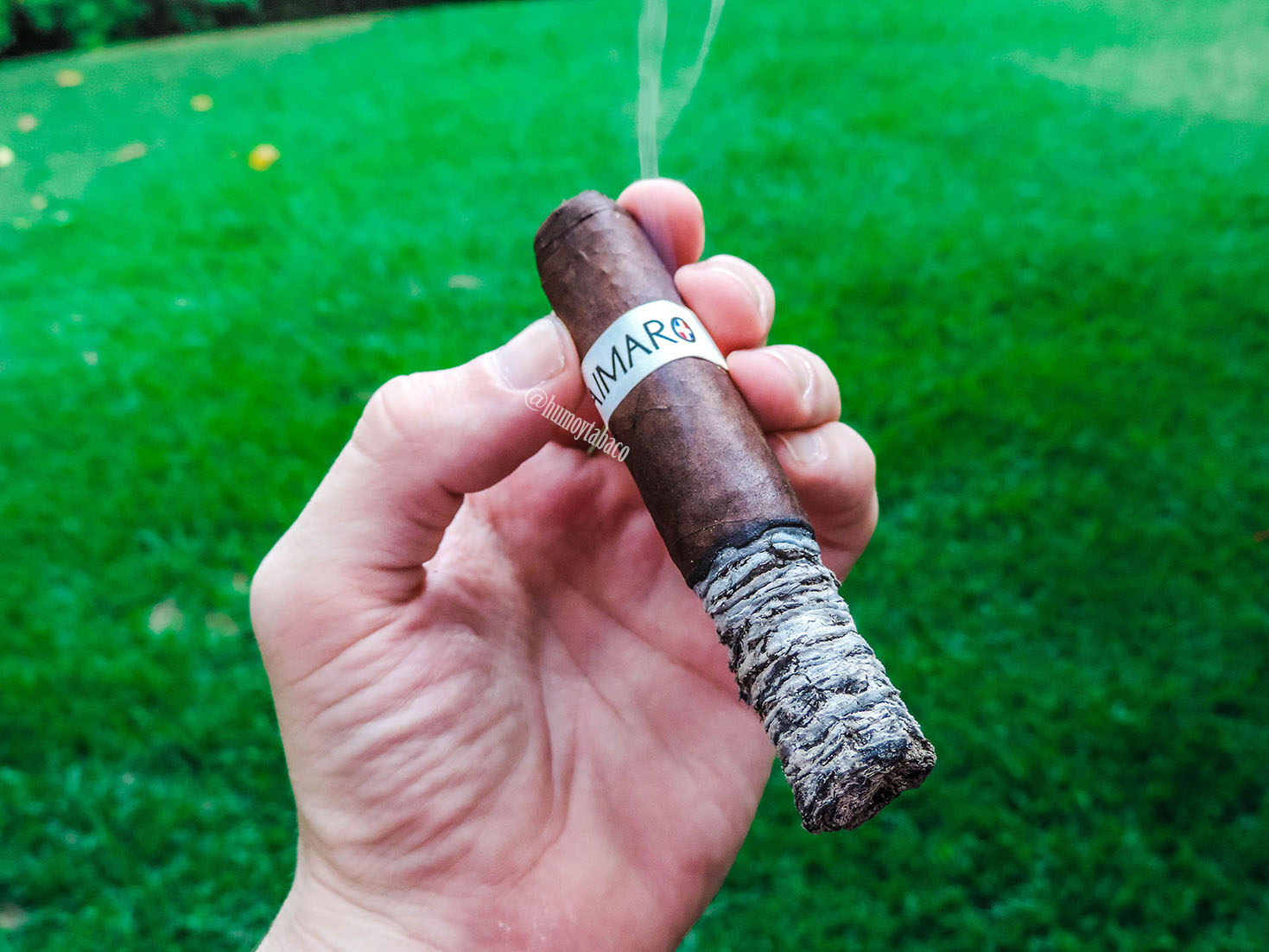 El Guaimaro tiene 5 meses en mi humidor (y acabo de revisar, tengo otro que tiene un mes de guarda) y eso no debería cambiarle mucho los sabores, solamente aclimatarlo y asentarlo para tener el sabor que el ligador espera, y si es este, tenemos un gran ganador aquí. No solo eso, aunque es un cigarro de producción baja, es regular, por lo que eventualmente debería (teóricamente) ser más fácil de conseguir. Dicho esto, el Guaimaro no solo es un cigarro de producción modesta; es un gran producto de calidad, siendo de la misma gente que fabrica los RomaCraft eso no debería sorprender. Hacia el último tercio los sabores de canela y caramelo son lo más obvio y el tiempo total de fumada casi alcanzó las dos horas… en un robusto. Sin duda es un cigarro para buscar. En términos de anilla, si bien aprecio el gran arte que algunas anillas llevan, también puedo apreciar los diseños minimalistas de otras, aunque este es prácticamente de impresión casera… pero con todo eso, se ve muy bien.
