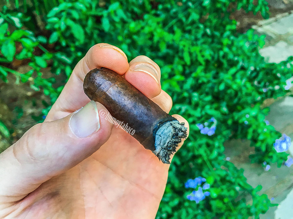 Las fotos no son las mejores y culpo al móvil. Luego de 3 años con él, glorificando y vanagloriando las fotos que hago con el teléfono, ahora que decidí cambiarlo (estoy a la espera del reemplazo), comienza a tomar fotos de menor calidad, aparentemente. A lo largo del primer tercio se llegan a apreciar mayores intensidades de café que de tierra, pero en el retrogusto se aprecia un chocolate malteado muy agradable, que me hace fumar más y entre eso y las caladas constantes para mantenerlo encendido, el cigarro se calienta mucho.
