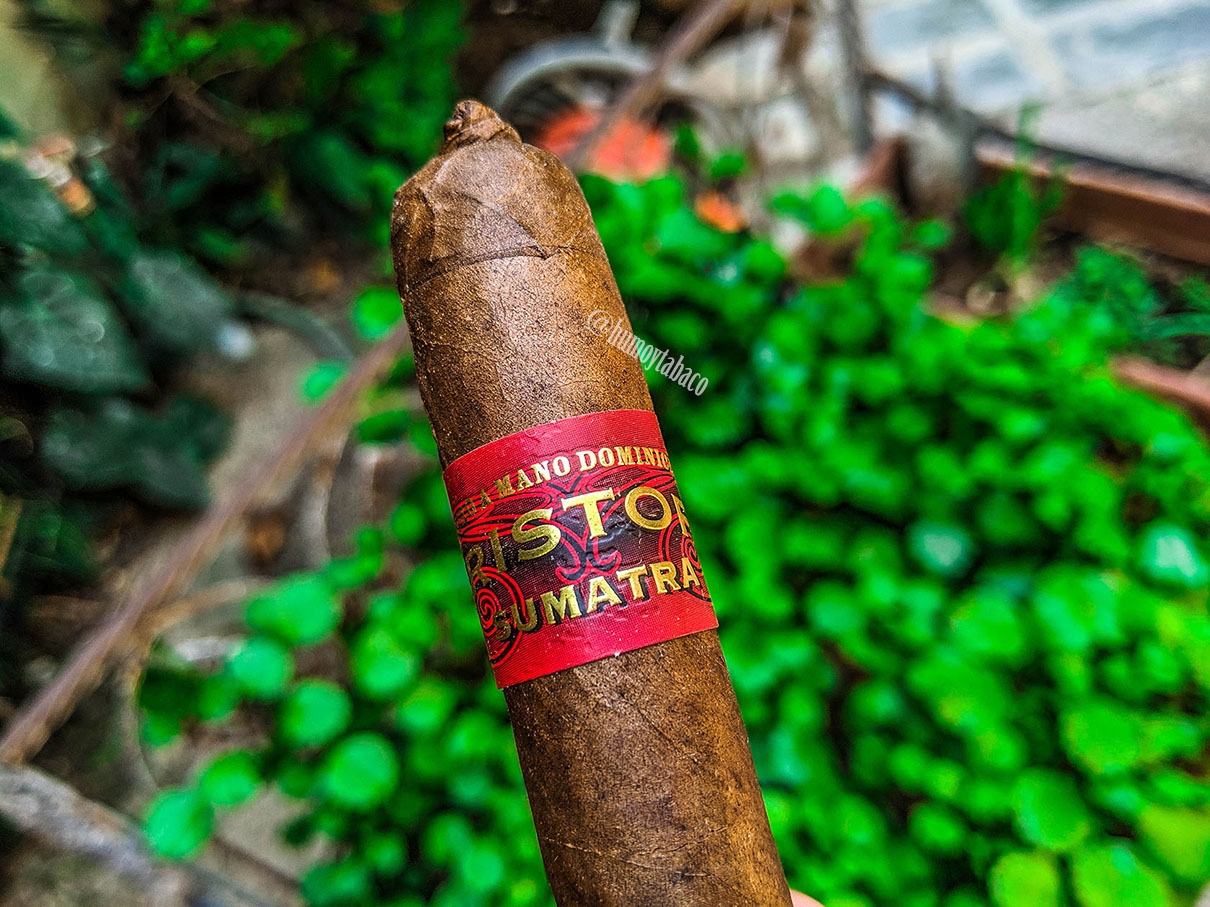 El cigarro en sí no es particularmente bonito, pero creo que eso es lo que ha caracterizado a los Kristoff que he fumado y una de las razones por las que no los había comprado antes: no son atractivos. La anilla es cualquier cosa y las capas por lo general son bastante irregulares, corrugadas y opacas. El Sumatra no es excepción, pero particularmente también me molesta que es un cigarro que apunta y se define como la alternativa a los cubanos, y yo creo que el tabaco dominicano, nicaragüense y hondureño, por mencionar a los principales productores, ya debe alejarse de mencionar tanto que es una ‘alternativa’ al habano, cuando el producto en estos países llega a ser muy bueno de por sí (en mi opinión, hasta mejor) y por más que sea, quien quiere conseguir un producto cubano tiene cómo hacerlo. No hay que estar creando ni recreando productos con el fin de que sean una alternativa, sino un buen producto de por sí. El Sumatra tiene una capa ligeramente oleosa y llena de venas, se siente bastante esponjoso e irregular, con un rabito de cochino y un pie cubierto… cosa que no es común, pues uno de los dos siempre lo es, pero ambas puntas irregulares es un poco más raro. Esta capa tiene aromas de madera y un cierto perfume que puedo describir como notas florales. En el pie se aprecia la capa por estar cubierto, pero la calada en frío presenta toques de pimienta y especias como la canela.