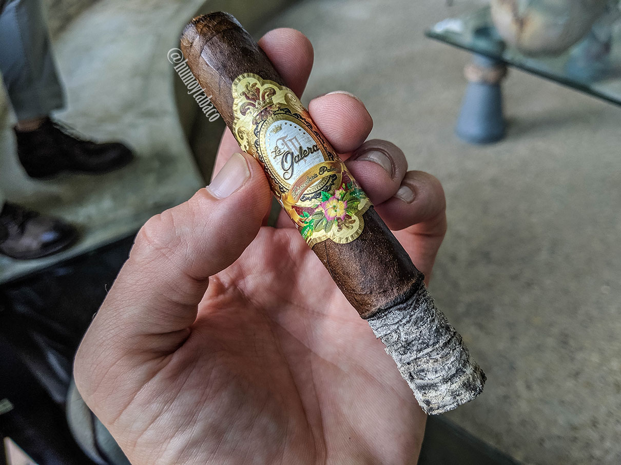 La Galera es propiedad de Jochy Blanco, quien últimamente ha sido más reconocido por su trabajo reciente con AJ Fernandez, aunque estos productos de La Galera son previos a su trabajo conjunto. El Maduro tiene una capa mexicana de San Andrés que es bastante sutil aunque tiene una apariencia más corrugada de lo que se siente; también tiene un nivel interesante de brillo, pero no se podría llamar lisa. Tiene aromas típicos como son la paja y la canela, pero también tiene un aroma láctico que es muy interesante pero no me atrevería a describir como un producto per se. Luego de picarlo se siente un tiro muy suave y sabroso que me suelta aromas dulces que me recuerdan a un típico coffee cake, por lo que incluye torta, café y sabores similares. Pero ahora lo voy a encender a ver cómo sabe con fuego.