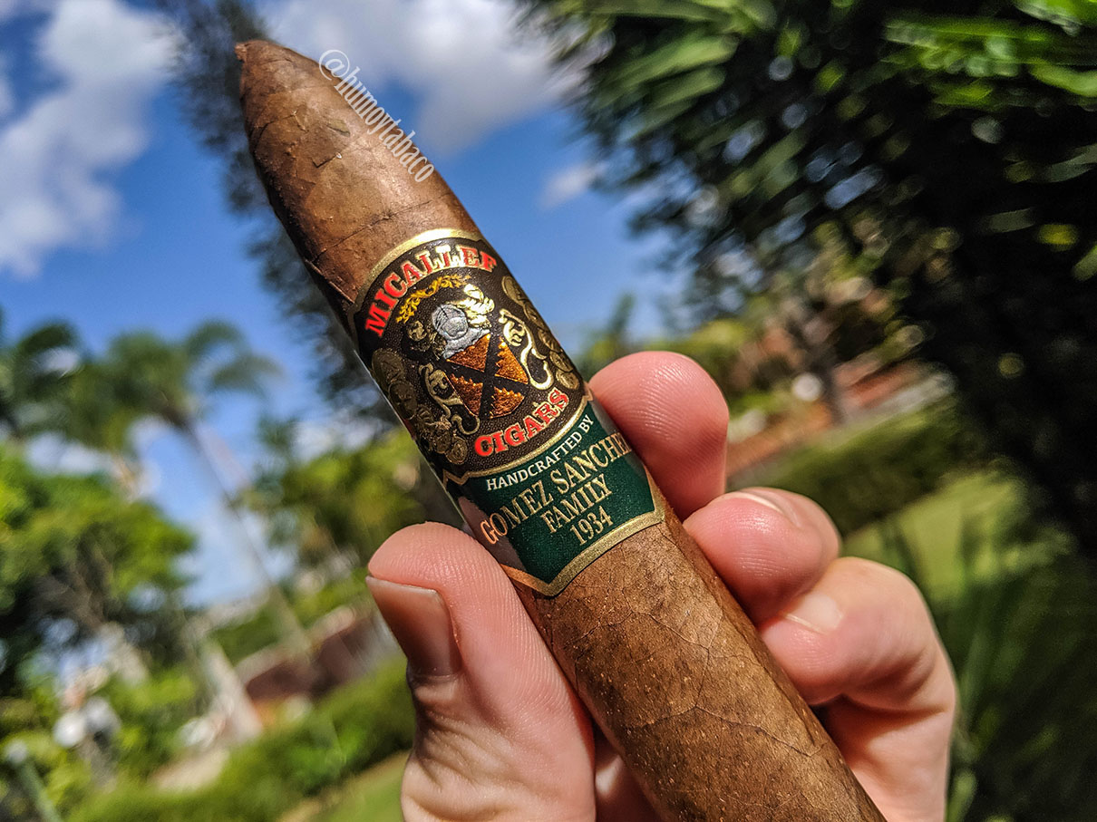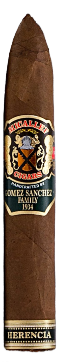 La marca Micallef realmente es el esfuerzo conjunto de dos familias: Gomez-Sanchez, quienes comenzaron en 1934 en Cuba con marcas como H. Upmann y quien luego se exilió en las Islas Canarias, aunque su hija Migdalia eventualmente terminó en México, donde cultivaron tabaco y abrieron una fábrica en Nicaragua y eventualmente consiguieron un socio capitalista de apellido Micallef, quien quiso poner su nombre en el cigarro. En el caso del Micallef Herencia, se trata de un torpedo box pressed con capa habano nicaragüense, capote sumatra ecuatoriano y tripa nicaragüense y hondureña, de los que todos tienen 4 años de añejamiento. Los aromas que desprende la capa son realmente escasos, incluyendo apenas establo. La calada en frío es igual de escasa, presentando toques de madera y dulce, pero no mucho más.
