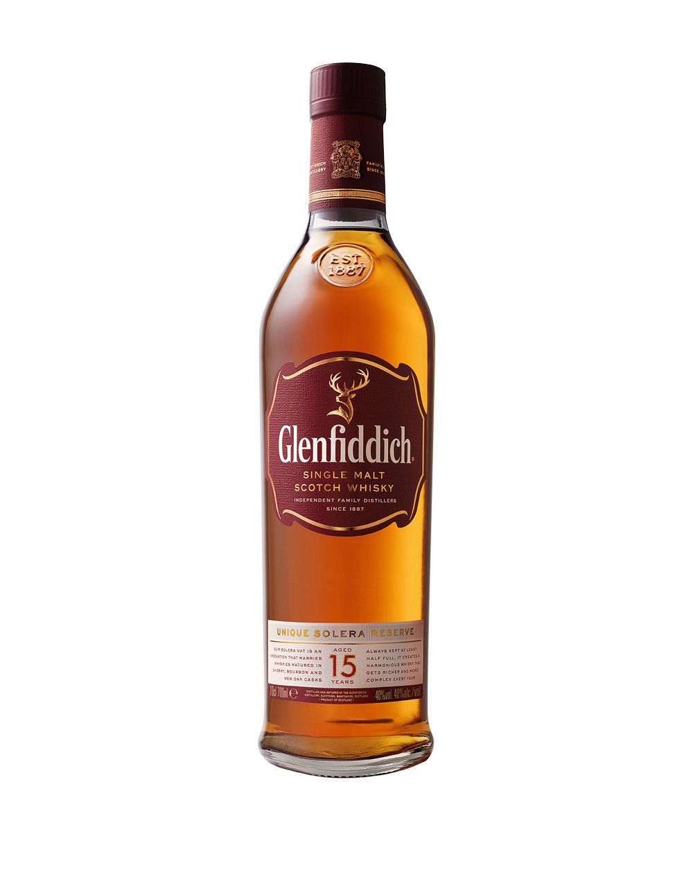 Este Glenfiddich 15 viene en una lata de metal que contiene la botella, y ambos contenedores tienen una forma particular medio triangular.