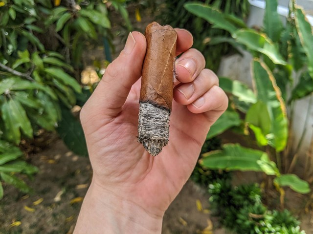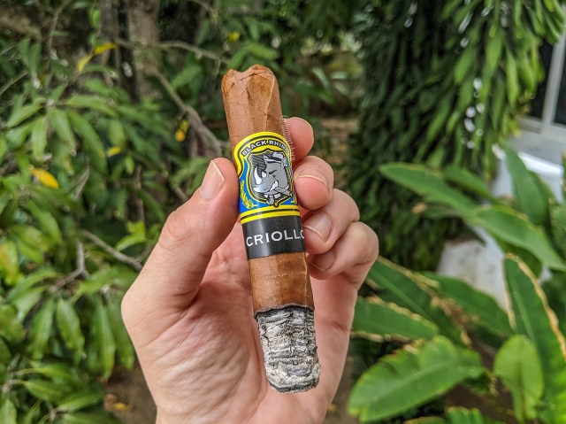 En el segundo tercio el Criollo mantiene una ceniza bastante sólida, aunque unos segundos después de tomar la imagen yo mismo preferí tumbarla, más que nada porque el anillo de combustión tiene una cierta variabilidad sospechosa que no me quise arriesgar… sospechosa porque sentía que se iba a caer, no por ningún motivo adicional. La razón por la que explico todo con lujo de detalles es porque el Criollo no ha cambiado mucho, destacando los mismos sabores de cuero, madera y nueces, pero con un matiz de madera seca y con pan (sin tostar) en el retrogusto.