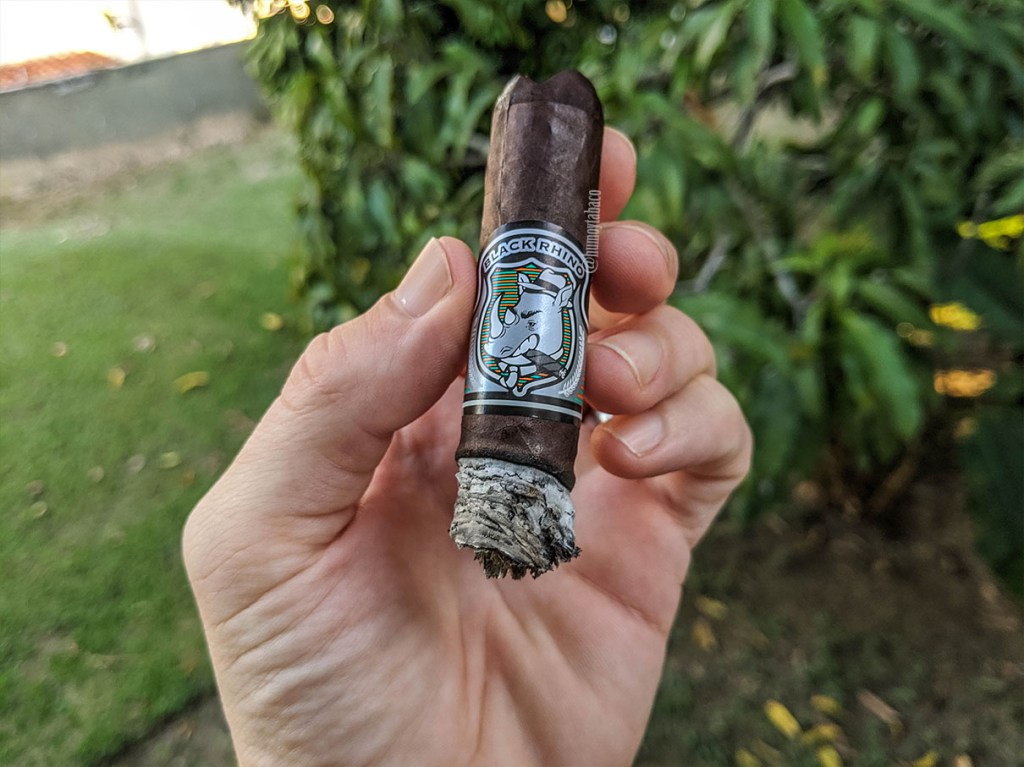 Sin embargo, gratamente puedo marcar un punto justo al final del segundo tercio o comenzando el último, en donde sí ocurre una transición interesante, pues los sabores principales de madera y chocolate se mantienen presentes y duran, francamente, hasta el final del cigarro. Pero también hay un sabor a café suave… no porque el sabor sea suave, sino que es como café americano, que se siente suave. Igualmente, le acompaña un sabor herbáceo y húmedo, que creo es el que me dio la nota de perro mojado en frío. Esta nota herbácea se repite en el retrogusto, aunque sí debo mencionar que ninguna de ellas es ‘perro mojado’ como tal. El cigarro se mantiene en una escala de sabores cada vez más suaves hasta el final, a donde llega luego de 50 minutos de encendido.