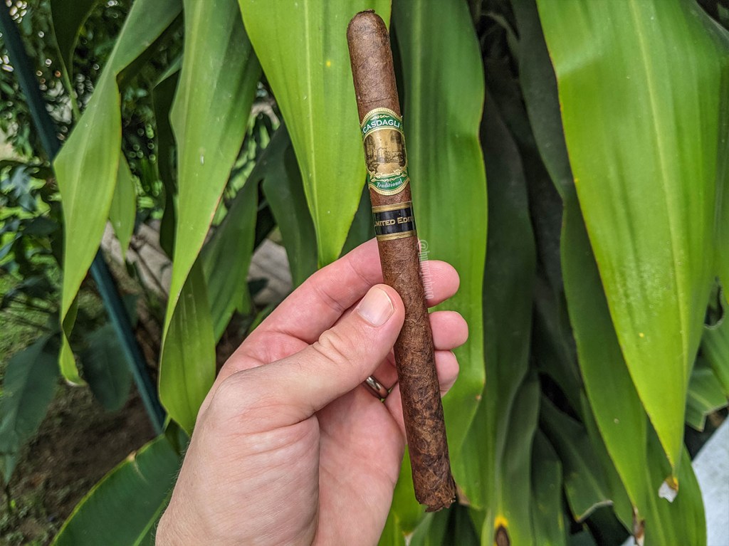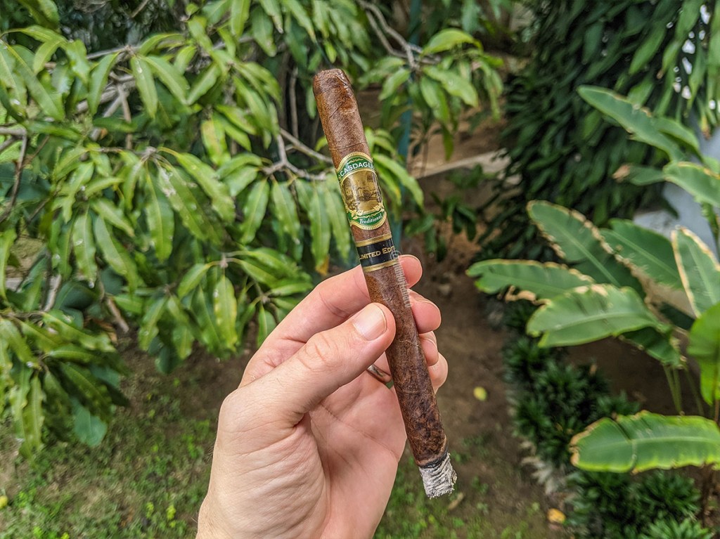 Así pasó que también este Casdagli lo he probado antes, pero en el formato Cotton Tail, que me gustó bastante. Pero como mis reseñas repetidas suelen ser porque se trata de una edición especial o una vitola muy diferente, es exactamente por ello que pruebo este lancero que además es edición limitada, con el nombre de Gran Café y medidas de 7,6x 39. El lancero se siente bastante firme, aunque no uniforme, pues tiene algunas zonas más esponjosas que otras. Los aromas en esta gran capa son predominantes de chocolate con una especia tipo nuez moscada muy leve y cuando lo pico (nuevamente con la doble hojilla) los aromas de la calada en frío son de una nota muy rica de chocolate y un repele de paja.