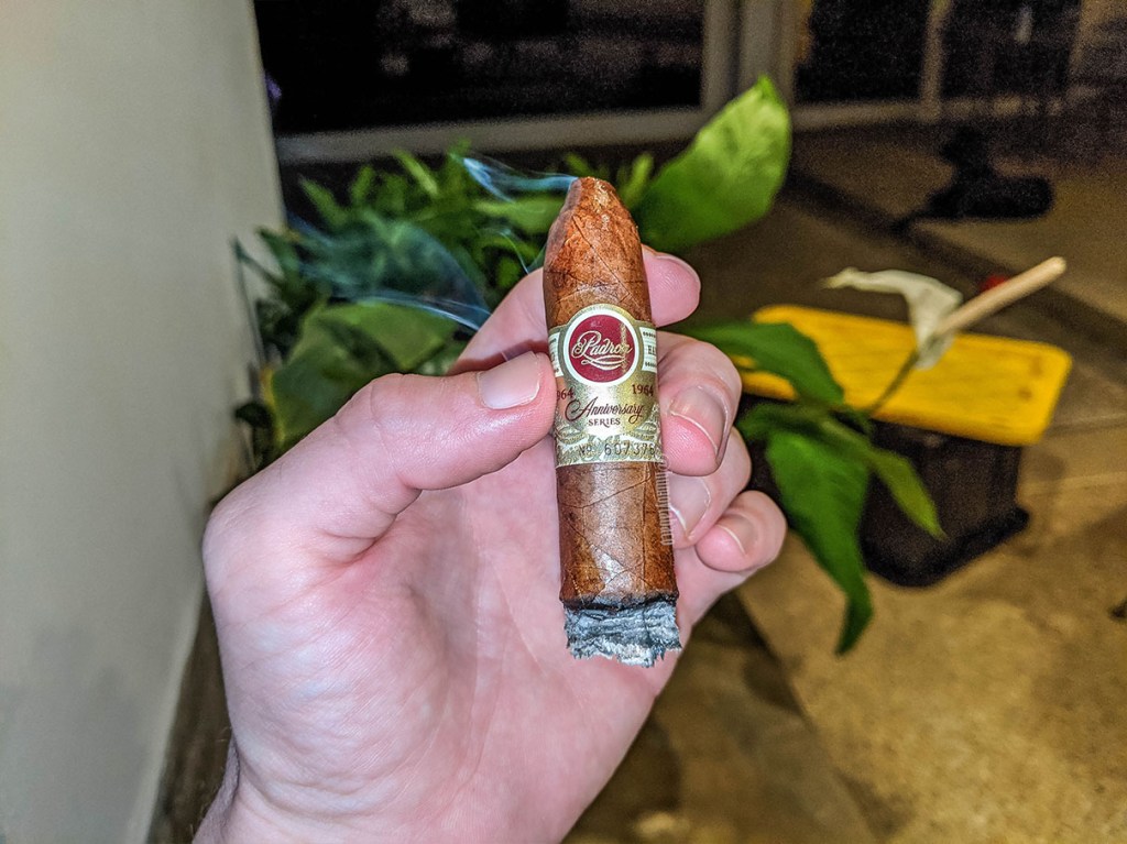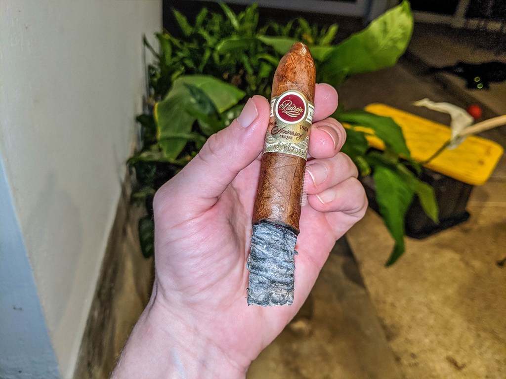 En el último tercio el 1964 Anniversary quema mucho más lento, aunque yo también hago un esfuerzo por darle caladas más cortas. La intensidad del cigarro es alta y la pimienta está mucho más presente en la lengua y el paladar, pero llego a un punto en que trato de no inducir el retrogusto porque en la nariz también se siente su intensidad. Quedando unos pocos centímetros de él comienzan a aparecer notas fuertes de nicotina que me llevan a fumarlo más lento pero, eventualmente, dejarlo. Hacia el final también comenzó a mostrar sabores suaves de madera y cuero, pero nada que significara un cambio en la tendencia de los sabores. Con un total de una hora y 35 minutos dejé al 1964 Anniversary apagarse solo.