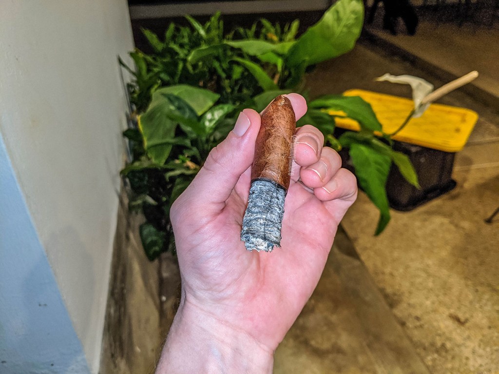 Cuando lo reseñe originalmente creo que estaba empezando a fumar en serio y, un poco molesto quizá porque pensaba que los cigarros rara vez superaban los $8 llegué a pagar $12 por él y por lo mismo fui quizá más crítico y no tuve la intención de comprar más. Pero cuando me llegó uno de ellos en el paquete mensual de Small Batch de octubre 2019, pensé que sería buena idea darle otra oportunidad. Por lo pronto la capa no me impresiona mucho, pues tiene muchísimas imperfecciones a nivel de textura y color, aunque las juntas no parecen problemáticas. Los aromas en frío en ella son suficientes para justificar esta segunda oportunidad, pues incluyen jarabe de chocolate y brownie. En el pie se aprecia una suave nota de pimienta y la calada en frío demuestra un tiro relativamente suelto, pero sin preocuparme mucho y aromas más suaves de chocolate y poca pimienta.