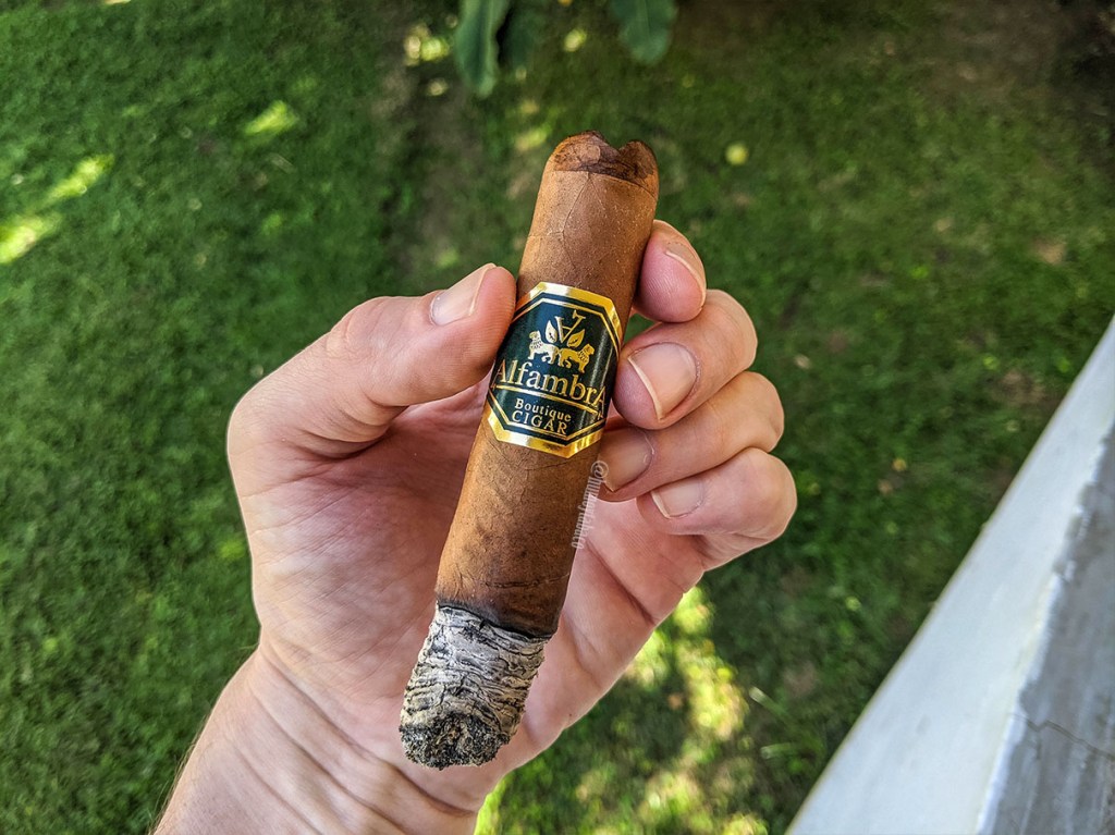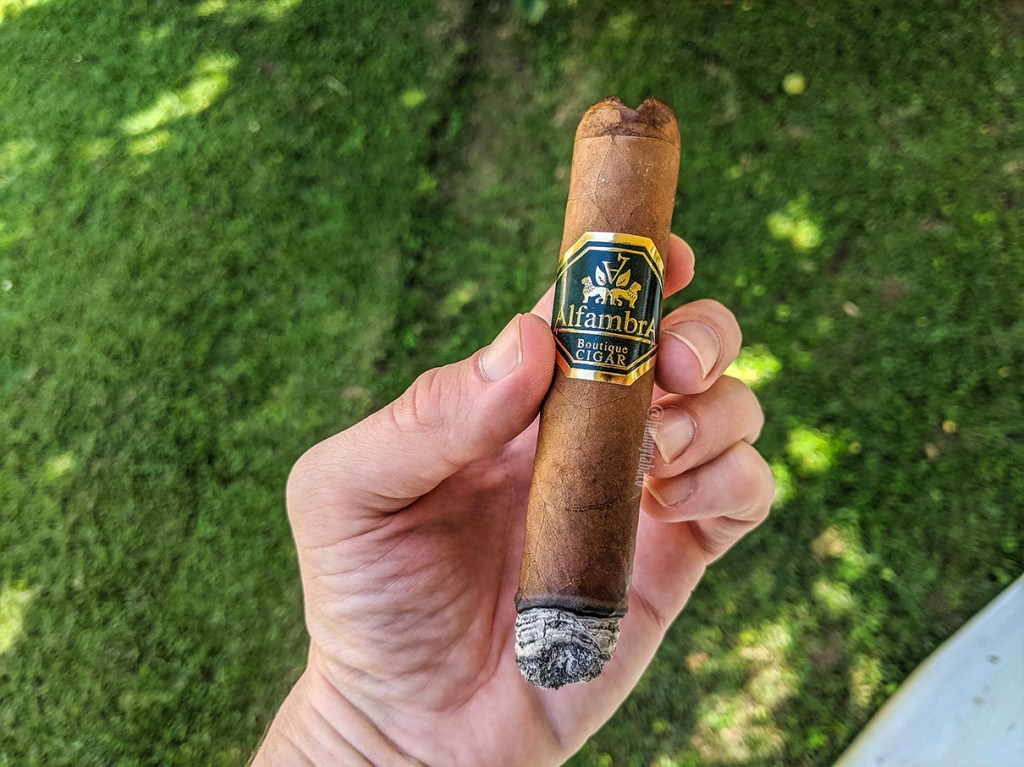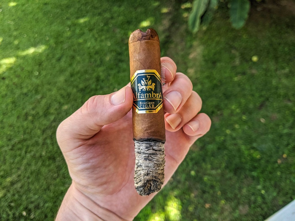 Para la mitad no hay casi sabores nuevos, pero sí quise destacar esa ceniza que se mantiene muy bien sobre el cigarro. También hay un cambio que vale la pena destacar y es que ese sabor de leña ya desapareció y ahora es pura madera sin toques ahumados, mientras que hacia el final del tercio aparece una nota de pimienta suave. Recuerdo cuando compré el cigarro y luego me reuní con unos amigos de Madrid y les conté lo que había comprado; muchos me comentaron que no habían encontrado mucho gusto en los Alfambra (en ninguno), por lo que me llama la atención que le sienta estos al cigarro, aunque quizá se deba a los 7+ meses de guarda que lleva en el humidor.