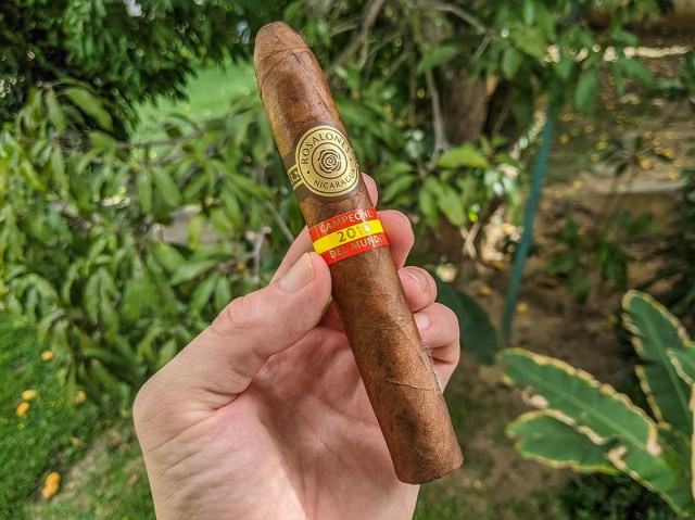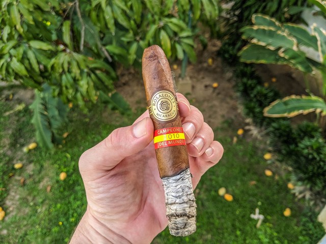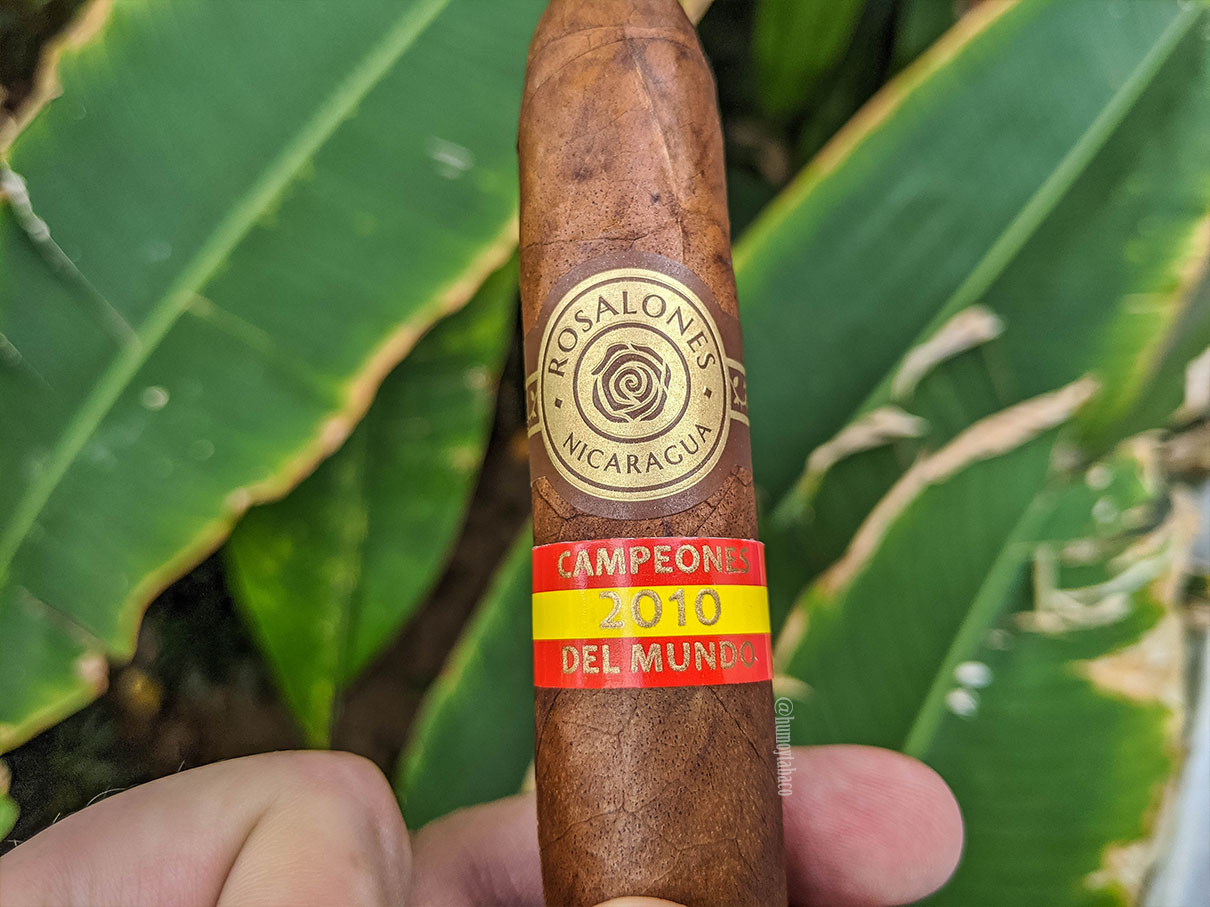 En la tienda también me dijeron que este Rosalones Reserva con la anilla de Campeones del Mundo es exactamente el mismo Reserva pero con una anilla más para apelar a más personas, pero que no logró su cometido. Otra razón más para comprarlo, pienso yo. Efectivamente vale la pena porque las primeras caladas me reciben con sabores de frutas dulces y rojas, madera y tierra mojada. El anillo de combustión tiende a ser recto, aunque uno que otro giro amenaza con dar problemas, pero se termina corrigiendo solo. También hay una nota suave de pimienta, lo cual es algo característico de los cigarros nicaragüenses en Europa, como que se aguantan un poco ese golpe de pimienta tan típico que existe en los nicaragüenses en Estados Unidos. Sin embargo, en el retrogusto se siente solo pimienta, sin mayor intensidad.