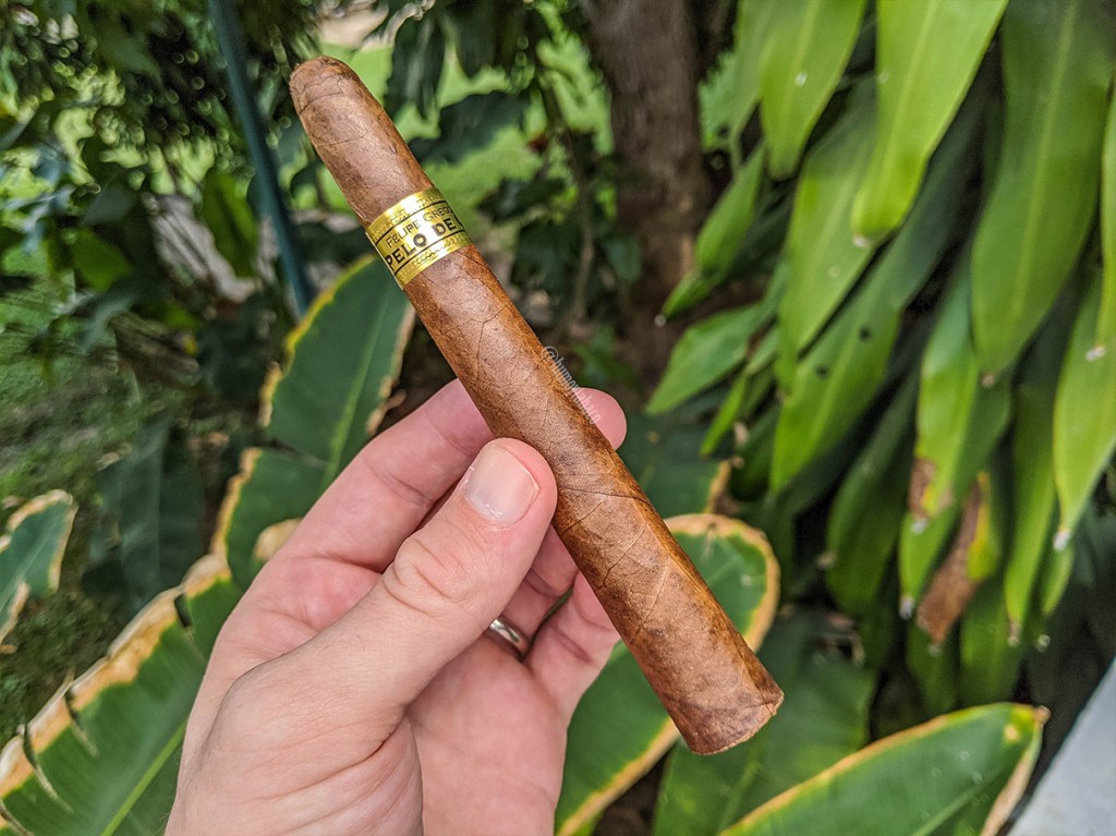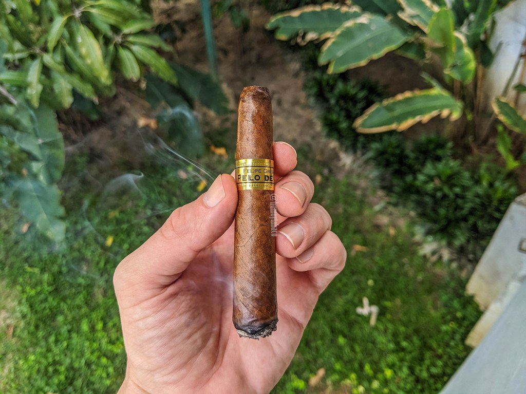Estoy feliz de fumarme este cigarro. No porque me llame demasiada atención la liga ni el cigarro en sí, ni la marca, sino porque por su forma piramidal ha sido un tema en el humidor, siempre descuadrando el orden de los cigarros y haciendo que todos los que están a su lado comiencen a desviarse. Ya lo fumé y pronto conseguiré algo más que me descontrole. El hecho es que este Pelo de Oro fue lanzado por Felipe Gregorio en 2006 con una liga bastante variada de orígenes, pero en 2014 lo volvieron a lanzar con una liga proveniente únicamente de Costa Rica con hojas ancestrales llamadas Pelo de Oro, que crecen a mil metros sobre el nivel del mar, en la cordillera central de Costa Rica, a cuya altura al parecer no necesita pesticidas ni le caen insectos.