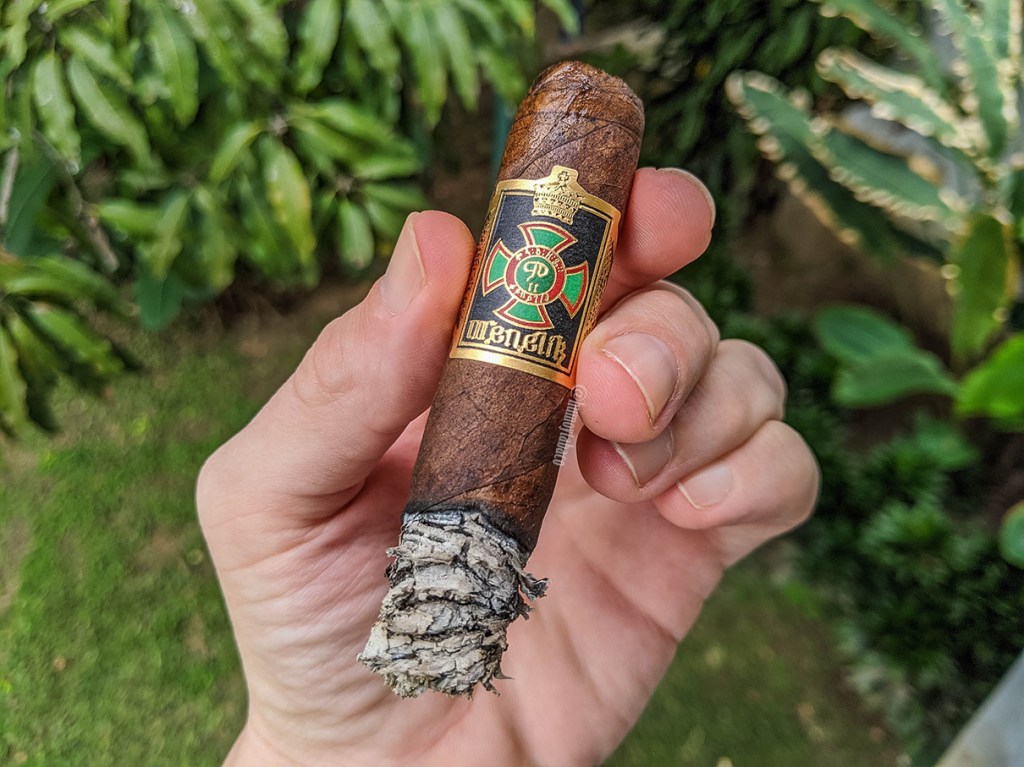 Aunque el anillo de combustión no es perfectamente recto, tampoco es algo que preocupe. Sin embargo, la forma de la ceniza sí me llama la atención y no me da buena espina sobre lo que pueda ir viniendo. No obstante, gracias a una fumada lenta el cigarro va evolucionando muy bien y tiende a corregir estos pequeños problemas que podría mostrar. Con casi 9 meses de humidor, en verdad no hay porqué pensar que no vaya a estar en su punto y en el segundo tercio lo demuestra con un suavizado de la intensidad de pimienta y la aparición de nuevos sabores como tierra, chocolate y notas ahumadas de madera. Tal pareciera que es una nueva experiencia en este tercio, pues los sabores de regaliz desaparecieron por completo, mientras que el café se mantiene en el fondo con un toque dulce que puede o no ser melaza ya.