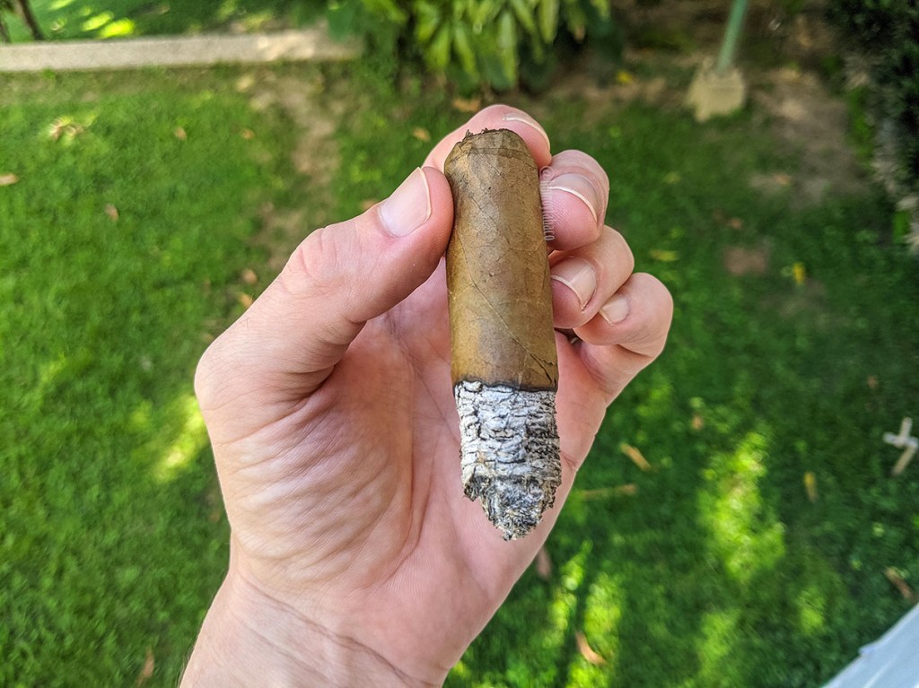 Al segundo tercio el sabor vegetal sigue siendo el principal, aunque ya es como el 75% del sabor, pero el resto de los sabores siguen siendo de raíz herbácea, destacando grama, eucalipto y un sabor a tierra mojada que es quizá el que más cambia en la fumada, pues se va haciendo cada vez más fuerte. El retrogusto es de un ligero sabor ahumado y cremoso, pero no mucho más que ofrecer, sino hasta la mitad del cigarro, que se siente un sabor como de canela y de algún fruto seco que no está maduro, sino verde. Sin duda casi todos los sabores del cigarro los puedo relacionar con el color verde. No obstante, bien pareciera que el tiro apretado no es un error de construcción, sino que definitivamente es así, pues nada que mejora pero eso no me ha impedido fumar el cigarro tranquilamente, aunque la densidad del humo sea casi inexistente.