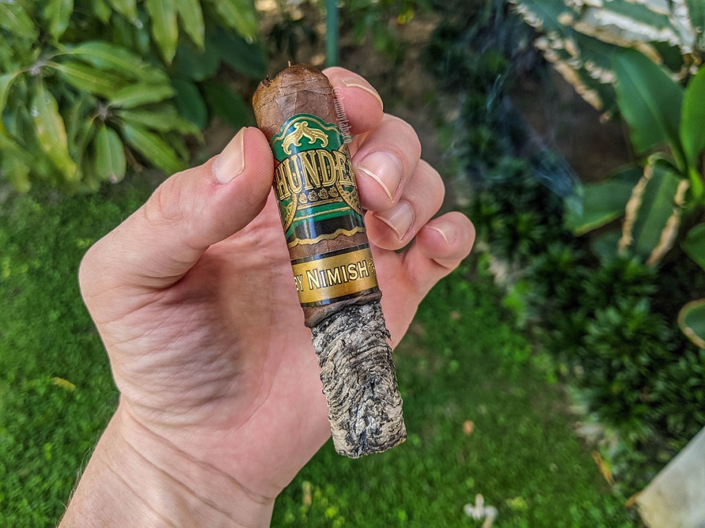 Para el segundo tercio el Nimish Thunder en mi mente ya no es una baratija descartable, sino un cigarro con una construcción muy decente aunque sabores bastante suaves. La pimienta sigue siendo un sabor bastante sutil y es el cuero el que más se siente, aunque el café también es uno de los sabores principales. También hay un sabor a papel mojado que, evidentemente, no es agradable. La intensidad si aumenta un poco cuando supero la mitad del cigarro y pareciera ir aumentando a medida que avanzo con él. Otros sabores como chocolate y madera se sienten sutilmente y no en todas las caladas.