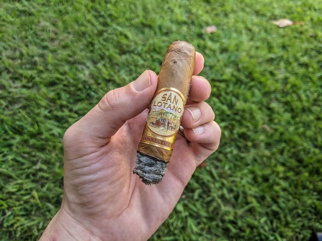 El San Lotano Requiem Connecticut tiene un nombre casi tan largo como lo es el cigarro, al cual le cuesta un poco quemar de manera uniforme, pero con estas dimensiones no es para menos. Los sabores son muy cremosos y de nueces en las primeras caladas, que luego esas nueces se sienten más como merey y el sabor de café parece con leche. Estos sabores tan cremosos y sutiles sin duda me engañan y me hacen pensar que el retrogusto sería más suave, pero cuando pruebo siento una nota muy obvia de pimienta, que no es intensa pero si está muy presente. La ceniza se aguanta muy bien, aunque la corona de la misma se cayó al poco tiempo de haberlo encendido. Hacia el final del primer tercio el sabor de frutos secos, que comenzó como nueces y luego se transformó en merey, se convierte esta vez en avellanas, aunque mantiene el de merey en el retrogusto.