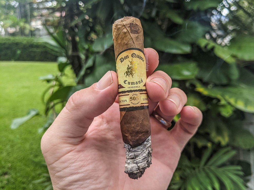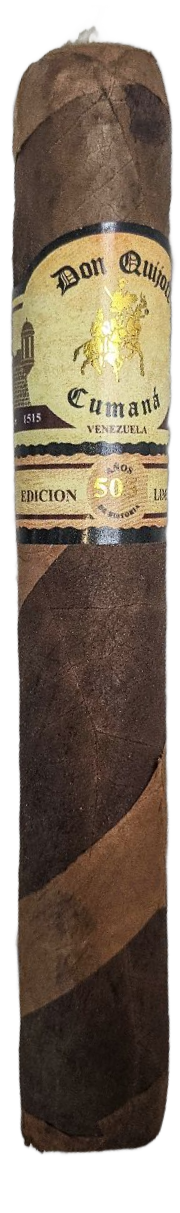 Para celebrar los 505 años de la ciudad, Don Quijote creó una edición limitada a 505 cigarros de una liga nueva. En efecto, es el primer cigarro de Venezuela en utilizar una capa estilo ‘barber pole’, que consiste en hoja Sumatra maduro mexicana y Connecticut ecuatoriana. Bajo esta doble capa hay un doble capote, o técnicamente son dos hojas pero no en el mismo estilo que la capa y este consiste en dos hojas venezolanas: Salón y Oriental. Finalmente, la tripa son dos hojas de origen cubano, por lo que podríamos decir que es el primer cigarro que incluye hojas de 4 países distintos. En verdad no estoy seguro de eso, pero sería interesante. En cuanto al cigarro en sí, en su capa presenta distintos aromas entre los que se destacan más los aromas propios de una capa Connecticut que los de la capa madurada, y estos incluyen aromas herbáceos y mentolados, que me recuerdan al pino. En la tripa hay aromas de madera y cuero, con un toque herbáceo mentolado, que bien puede ser el mismo de la capa que llega hasta aquí. Finalmente lo pico con la doble hojilla y el aroma principal en la calada en frío es madera vieja, pasas y una sensación herbácea con un aditivo como alicorado, como si se tratara de un mosto. Algunas notas lejanas de cacao también se siente.