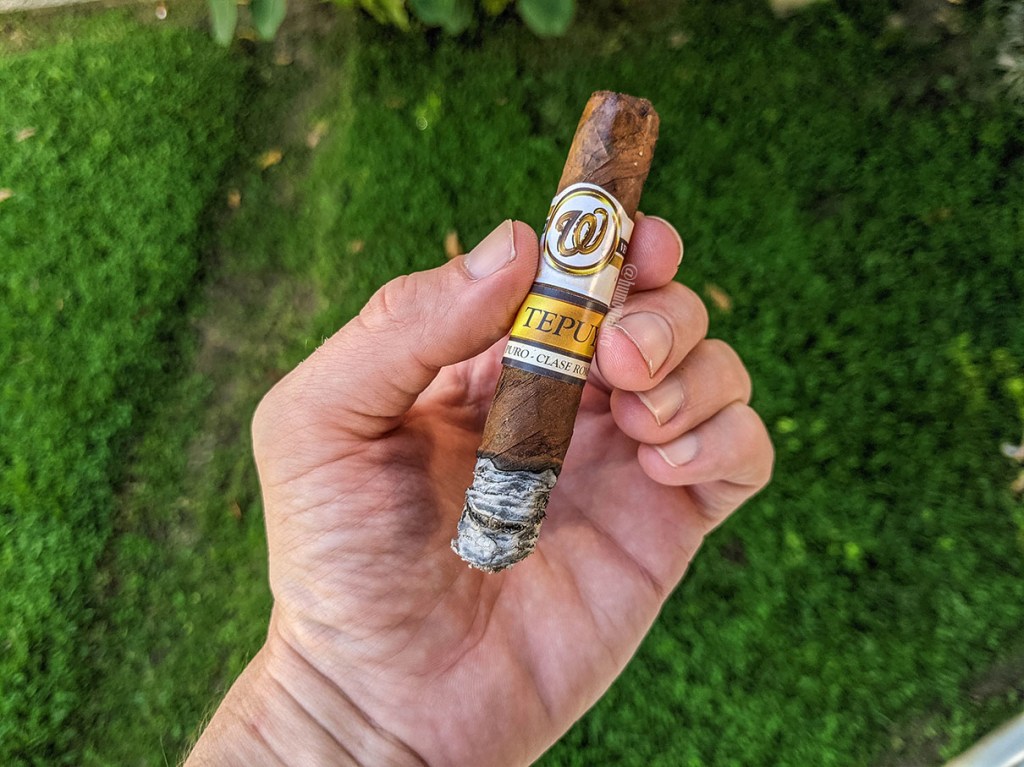 Con unas dimensiones de 5 x 38 en realidad me sorprende que me tome 20 minutos superar el primer tercio, pero este Tepuy quema lento y parejo, así que me considero afortunado. En el segundo tercio hay una sensación mucho menor de pimienta y más afrutado, aunque estos sabores de frutas no los diferencio, sino que es más como una amalgama de sabor. También se aprecian notas de café y canela, sobre todo cuando supero la mitad del cigarro. Justo en ese momento también la quemada sufre una desviación y me veo forzado a darle un retoque, pero nada demasiado intenso.
