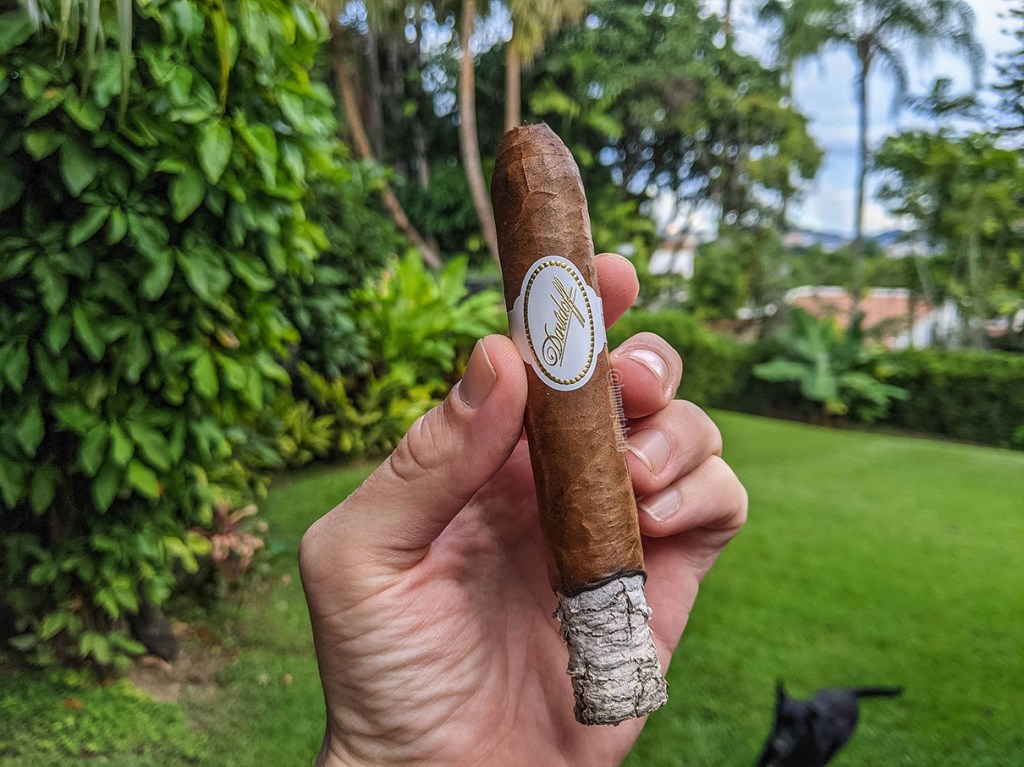 Para el último tercio la pimienta toma una nota más dominante, particularmente en el retrogusto, al tiempo que las notas cítricas también se sienten más intensas en el paladar. El anillo de combustión, quemada y tiro han sido muy al estilo prácticamente perfecto de Davidoff, pero en este tercio la densidad del humo es irregular. Al final, se traduce en una hora y 40 minutos de una fumada regular, tendencia hacia plana y no tan interesante como esperaría de Davidoff y de un cigarro de $20, pero que funciona bien como acompañante de un postre o un buen ron.