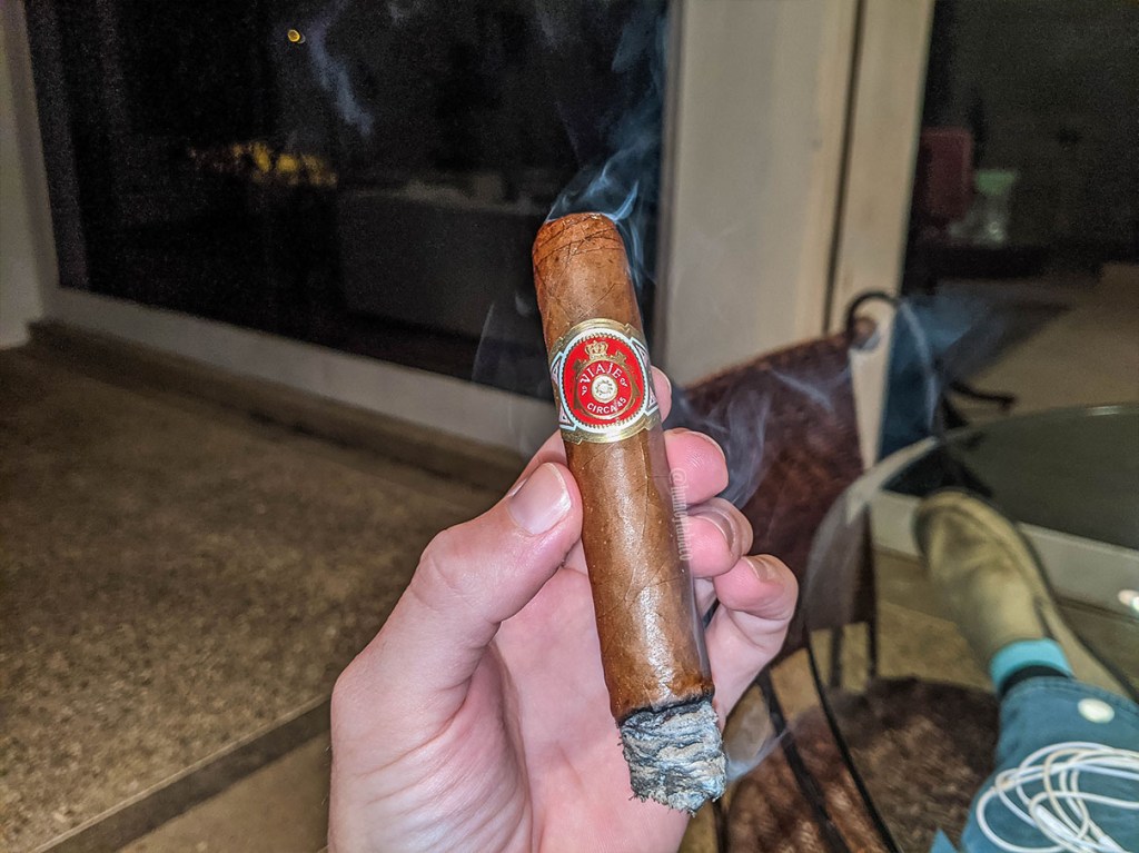 Para mi sorpresa el Circa 45 parece volverse de papel en el segundo tercio, desprendiendo casi ningún sabor, pero mostrando notas muy leves de sabores que poco relacionaría con un tabaco, como manzana verde, notas ácidas y luego madera, que esta última sí es típica, sin embargo, ninguno de estos sabores tiene la fuerza necesaria para considerar que el cigarro tiene esos sabores, son más como notas suaves dentro de un mar de nada. Sin embargo, la construcción, quemada, anillo de combustión y demás están muy bien. Normalmente, fumando un cigarro que empieza bien y que al segundo tercio parece arruinarse como este, pensaría que es un tema de construcción y esto sería evidente mediante una apagada repentina, quemada dispareja o algo que haga notar que el cigarro no se está comportando como debería. Pero el Circa 45 se comporta perfectamente en temas técnicos, por lo que no acabo de entender qué está pasando y la única razón que puedo pensar es que es hecho por PDR.