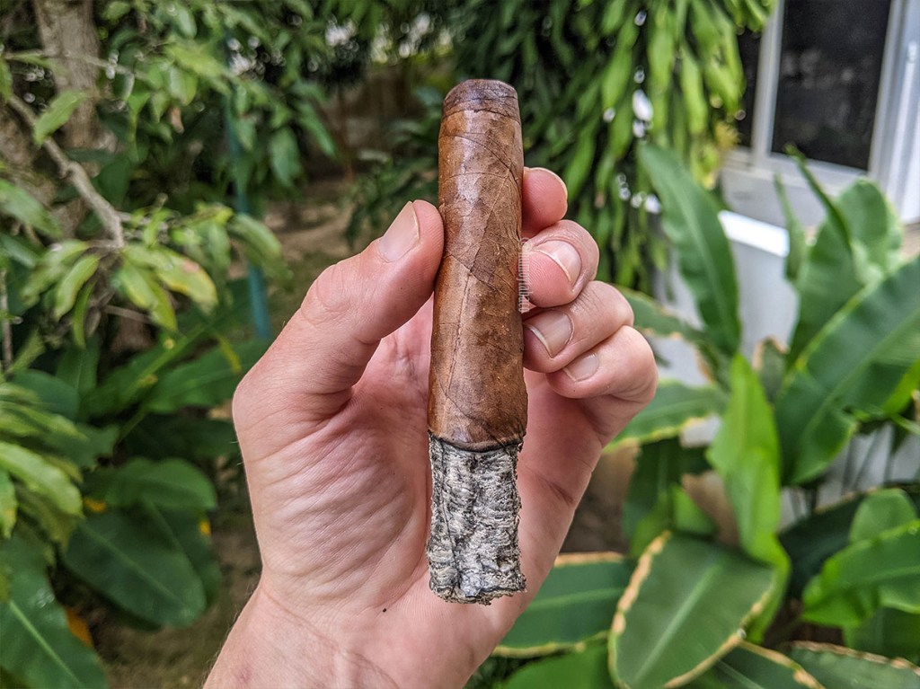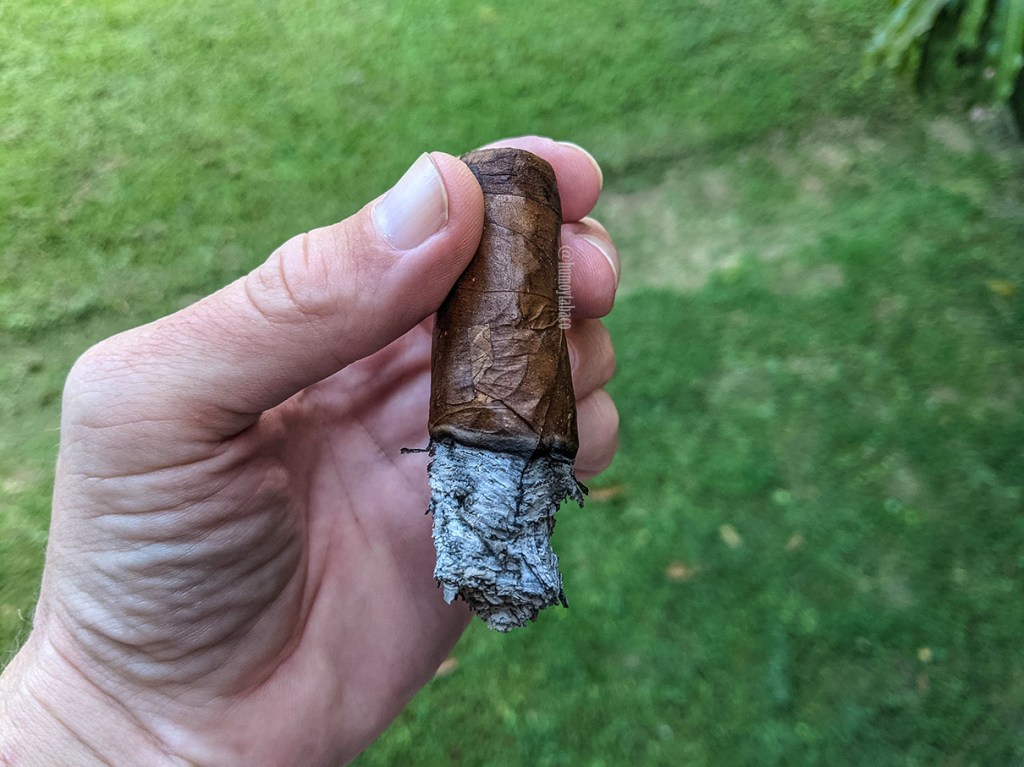 Me pierdo un poco en los matices del cigarro y la combinación de sabores a almendras, madera, café y pimienta, tanto que la foto del último tercio es mucho más adelantada que la del tercio anterior. La pimienta sigue presente en este punto, pero es realmente suave y su presencia se limita al retrogusto, en donde le acompañan sabores a almendras también. En el paladar las especias dulces que mencioné anteriormente parecen dividirse al punto que me deja identificar anís y canela, pero también hay café y madera presentes. El tiro se abre un poco y esto me permite desprender mayo densidad en el humo, pero la intensidad no se hace mayor y, si no fuese por la fuerza de la pimienta de la primera mitad, el cigarro tendría una intensidad media-suave. Al final, luego de una hora y quince minutos, el Don Rogelio Habano llega a su fin, con una apariencia bastante fea, pero buenos sabores.