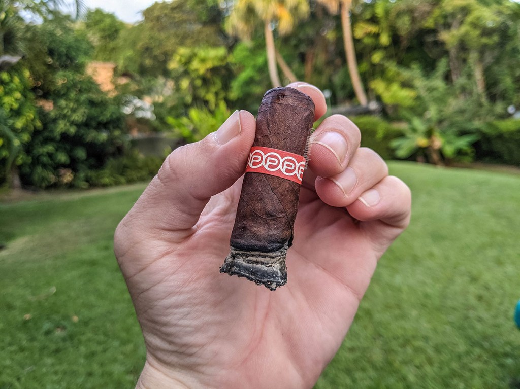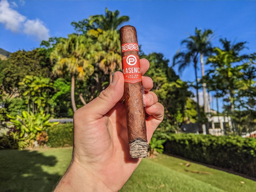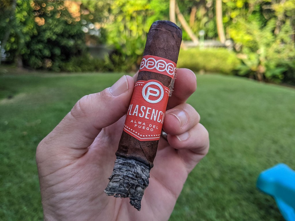 El último tercio de la al Alma de Fuego un toque más de complejidad y definición de sabores, que no le hacía falta pero es muy agradable igualmente. La intensidad está en el mismo punto que el tercio anterior, pero se siente muy equilibrado. Los sabores de pimienta y tierra siguen controlando el cigarro, pero en la lengua se sienten notas picantes como de pepperoncino, pero eso puede ser invento mío. Según la página de Plasencia, los sabores incluirían toques cítricos por sus hojas de Jalapa, pero la verdad es que no las encontré por ningún lado. La quemada se mantiene muy bien pero más lenta a partir de la mitad y hace que el tiempo total de fumada haya alcanzado las dos horas, que disfruté bastante.