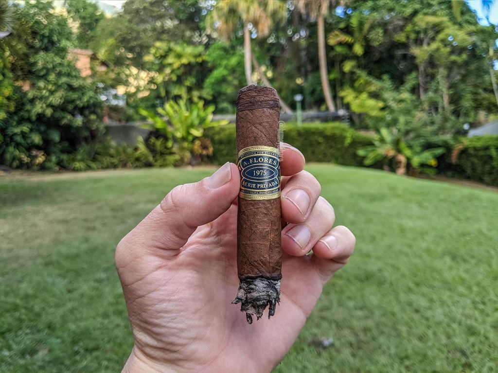 Para el último tercio la madera se coloca en la misma intensidad de sabor del café, en el liderato del cigarro e intercambiando esa posición constantemente, mientras que la mora y la pimienta son las que llevan la retaguardia de sabores. Esta tendencia se mantiene hasta el final, el cual alcanzo luego de una hora y media de encendido. En cuanto a su intensidad, he mencionado en ocasiones anteriores que le he perdido el miedo y, a veces, hasta el respeto a los cigarros de capa madura, pues para lo oscuros que son, realmente no se siente como una fumada fuerte, y el A. Flores 1975 Serie Privada Capa Maduro ciertamente sostiene esta tesis, pues no es nada fuerte, manteniéndose en una intensidad media de principio a fin. Sin embargo, tampoco es de sabores intensos, así que al final de la fumada no me sentí especialmente satisfecho.