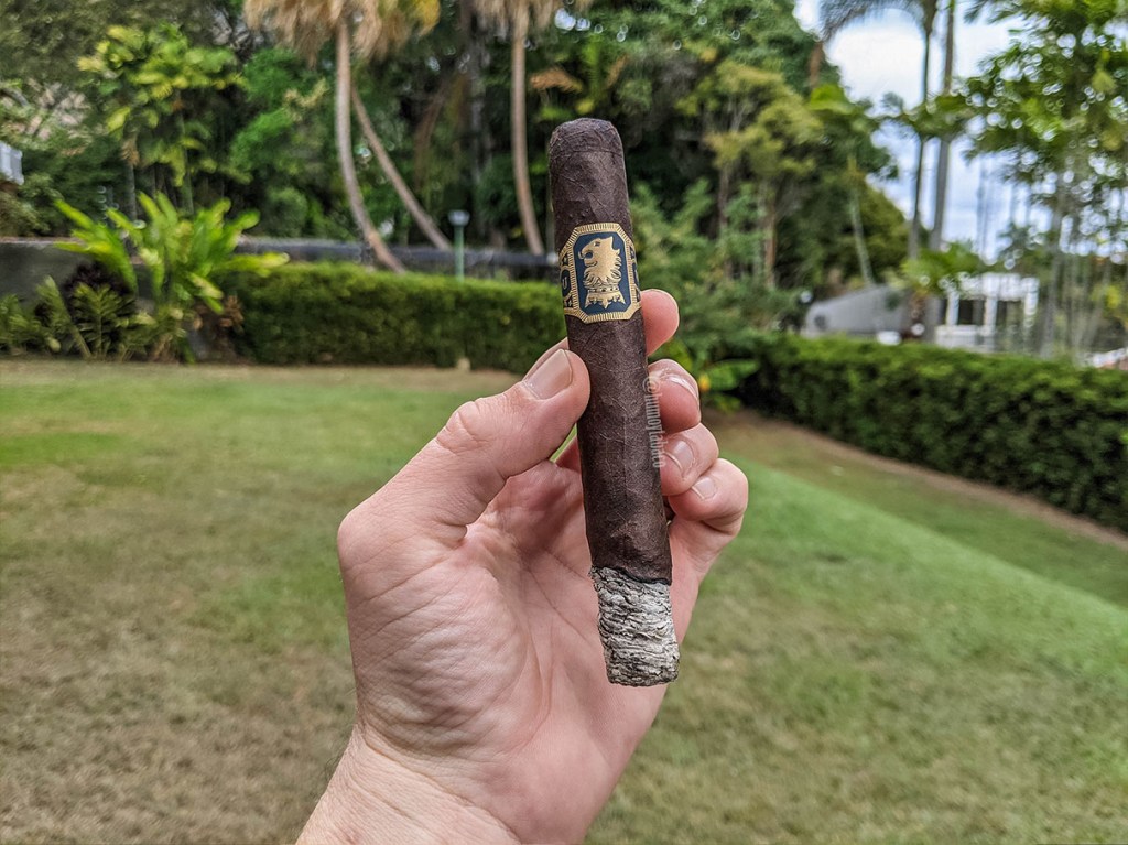 Visualmente es igual al Undercrown «normal», pero desde que se llama Maduro tiene una anilla adicional en el pie que lo identifica como tal. El cigarro se siente apretado y sólido, y ciertamente no es el primero que me fumo desde la reseña de 2016, principalmente porque se ha vuelto parte habitual de mi humidor en más de una vitola, así como sus primos Dogma y ShadyXX. La capa desprende aromas a paja, leña, tierra y regaliz negra, mientras que en el pie, luego de quitarle esa anilla, se aprecian aromas a madera y nueces. Lo pico con la doble hojilla y me encuentro con aromas a madera, paja, jarabe de chocolate y pimienta.