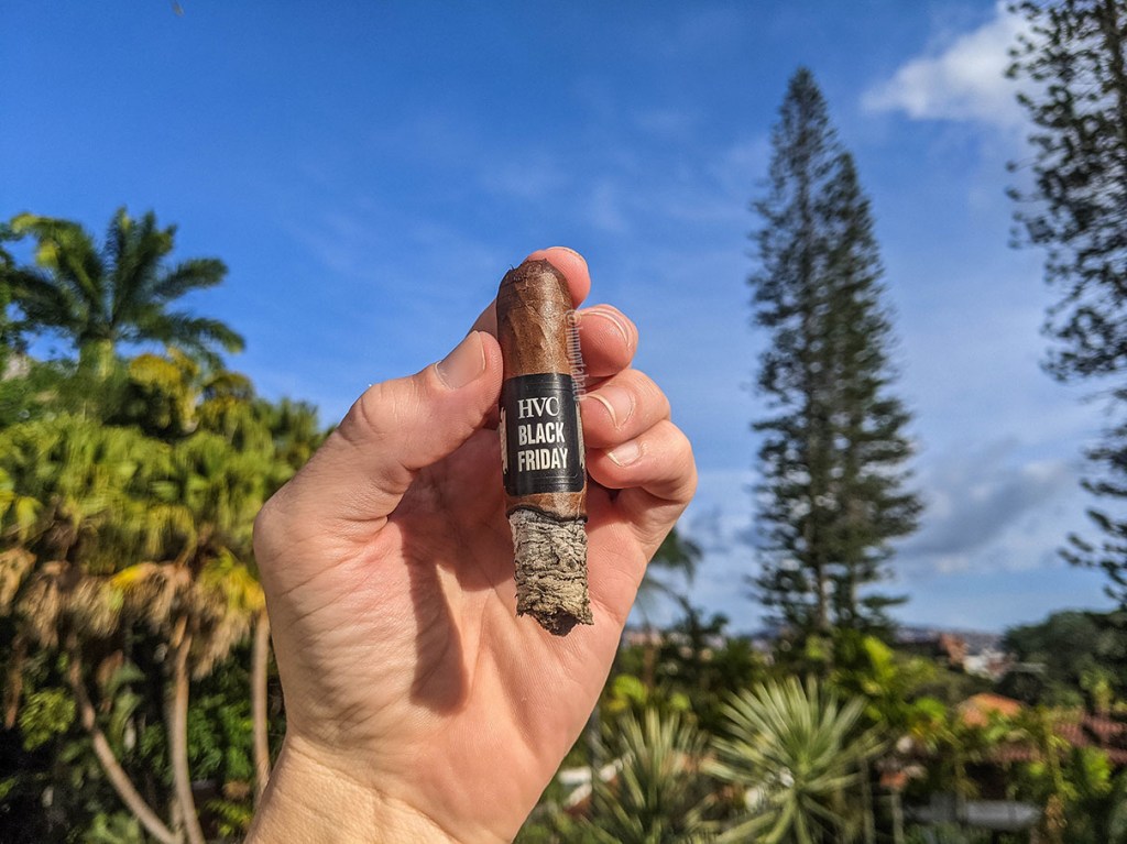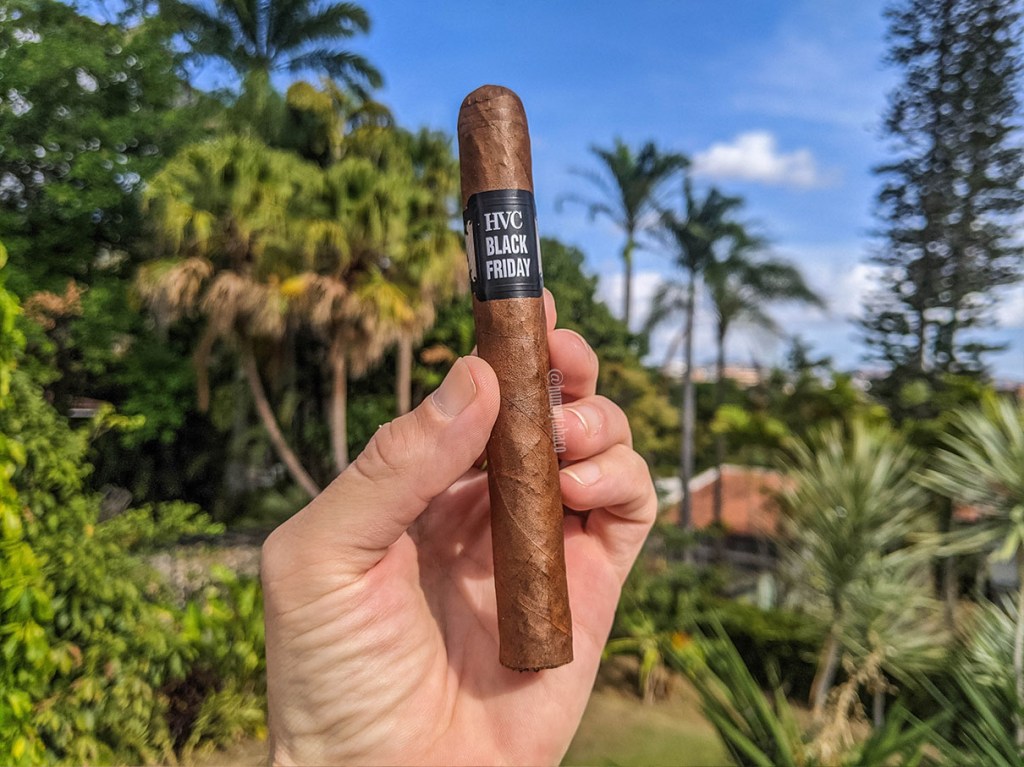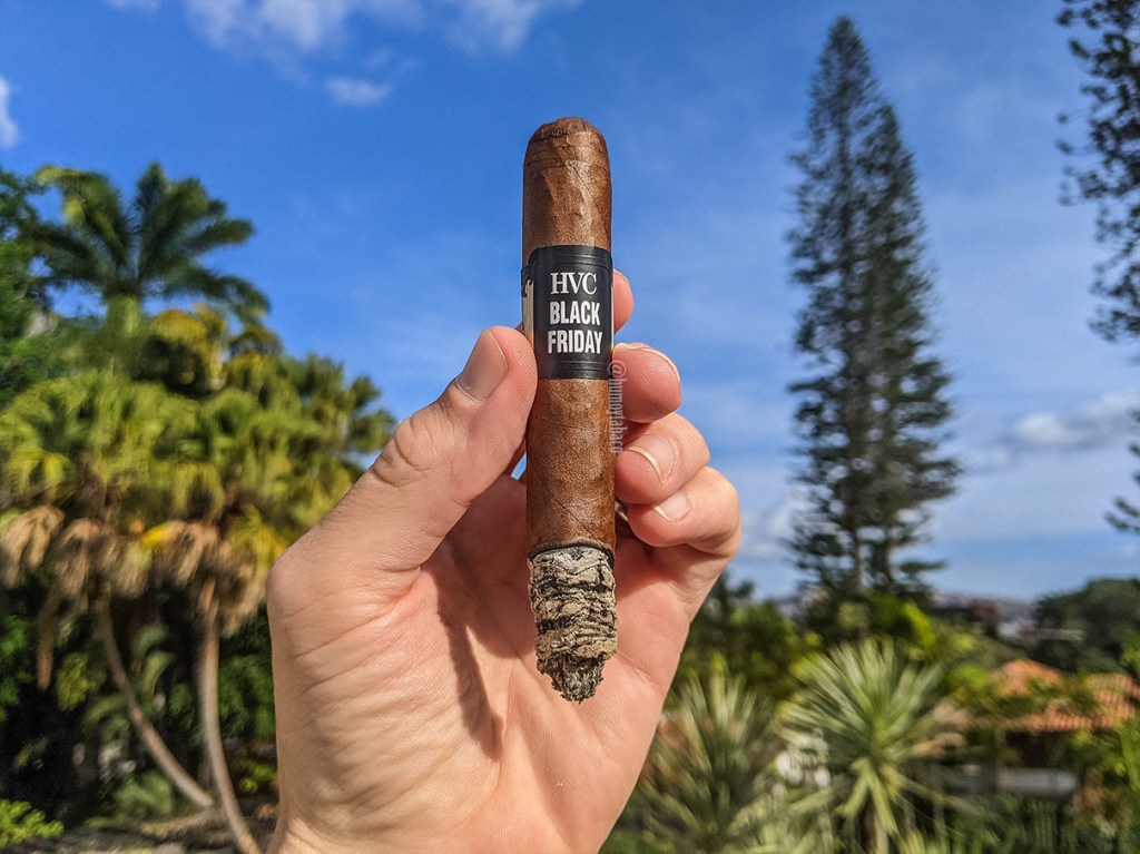 Entre todos los eventos, descubrimientos, natalicios y decesos que se celebran año a año, de verdad me llama la atención que exista un cigarro que haga honor a Black Friday, especialmente cuando no se trata precisamente del famoso Viernes Negro, particularmente de la historia económica venezolana, sino del último viernes de noviembre, o el que viene después de Thanksgiving, cuando los precios de muchas tiendas son reducidos y la gente se vuelve loca para entrar y comprar. Posiblemente sea una de las imágenes más crudas y tristes del capitalismo, pero el Black Friday 2020 quizá carecía de la histeria en la que después de la cena de Acción de Gracias las familias pasaban horas revisando los descuentos que aprovecharían al día siguiente. Pero el hecho es que Black Friday es una festividad y por ello HVC decidió hacerle un cigarro que produce anualmente desde 2015, y para 2020 incluso hizo dos versiones: el cigarro principal, que es el protagonista de esta cata, es un corona gorda 5,625 x 46 y una versión llamada Firecracker que es un 3,5 x 50.