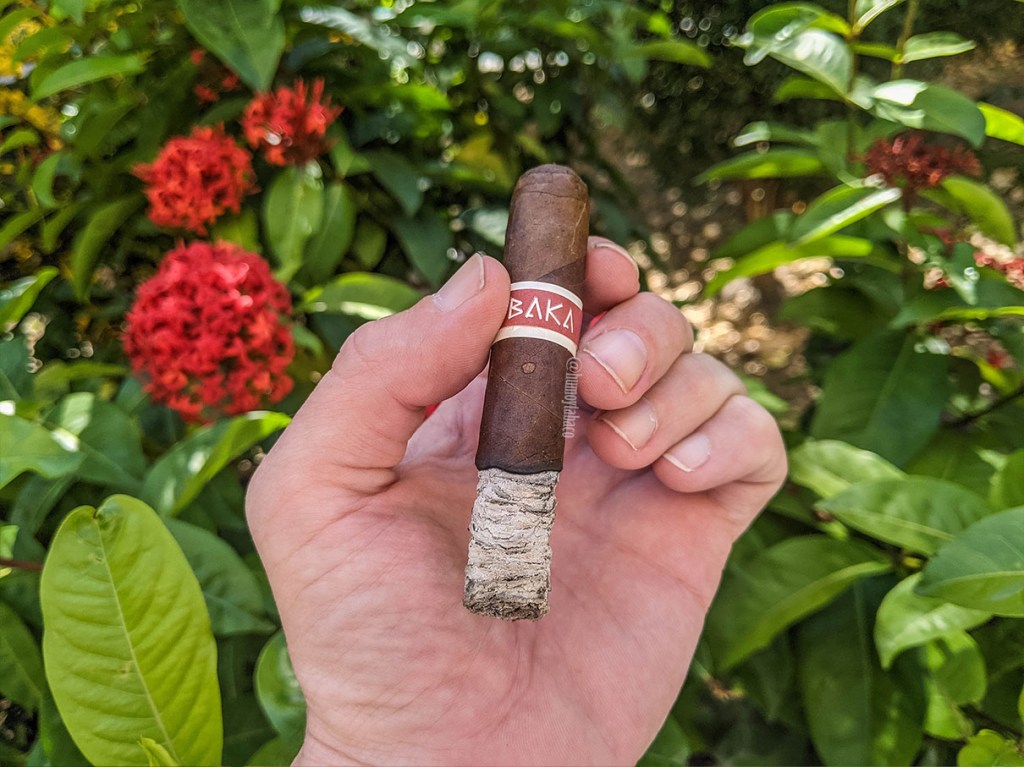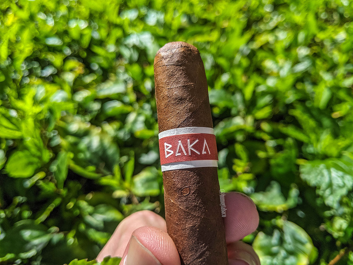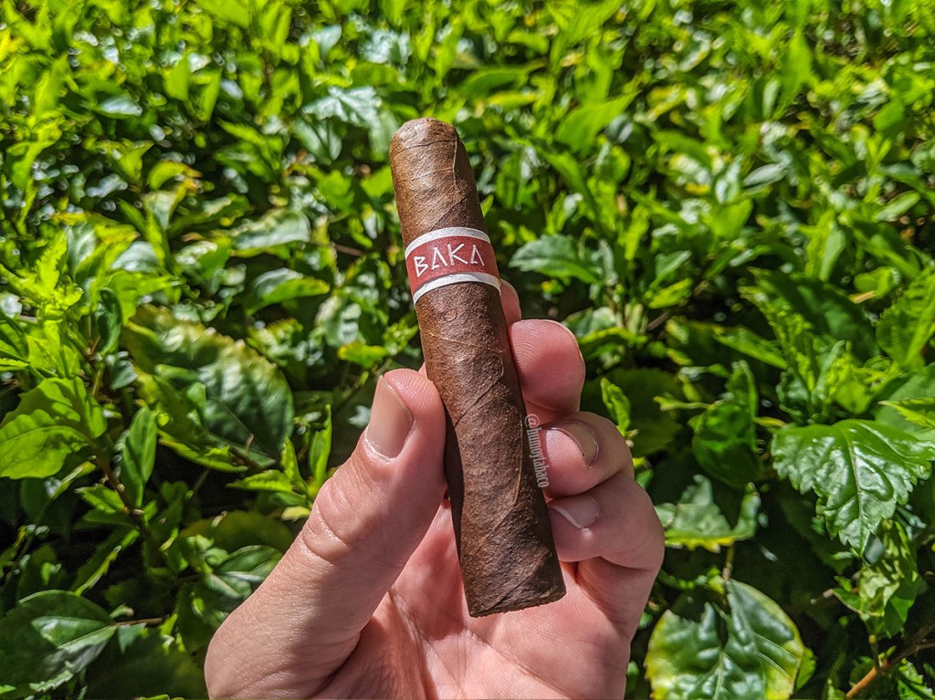La apariencia del Baka es la de un cigarro pequeño y, en efecto, lo es; la vitola se llama Pygmy y es un cigarro de 4 x 46, pero tampoco lo llamaría mínimo y en la mano se siente como un cigarro normal, especialmente porque estoy en un café público donde lo voy a probar, aunque también leí que era una de las ideales para probar el cigarro. La capa es oscura, con notas rojizas que contrastan muy bien con la anilla y el cigarro se siente bien empacado, sin zonas suaves. La capa tiene aromas a hojas de té, tierra, cuero, café y cáscara de naranja, mientras que la calada en frío tiene notas de canela, tierra, cuero y té.