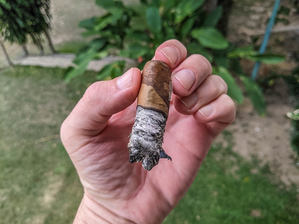 El anillo de combustión mejora en el último tercio, más o menos para cuando le quité la anilla, que es más o menos cuando comienza a sostener más tiempo la ceniza también. Los sabores son de cedro únicamente, habiendo despachado al roble más o menos a la mitad del cigarro, pero siguen presentes notas de cuero, una sensación tostada y no mucho más, al menos no permanente. En el retrogusto se sienten notas bastante suaves de café y nueces, pero estas existen solamente al principio del tercio y hacia la mitad del final se siente únicamente el de nueces. La intensidad es entre baja y media, aunque al final del cigarro se coloca en media y de ahí no se mueve, y al cabo de una hora y 15 minutos, el cigarro llega a su fin.