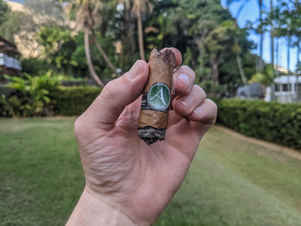 No hay grandes variaciones cayendo en el último tercio, salvo notas de nueces en el retrogusto, pero sigue quemando muy bien con un anillo de combustión bastante decente y humo abundante. Lo más importante: quema bien y estos cigarros low cost que se anuncian como productos de tripa larga a veces se descubren solos en los últimos tercios, cuando comienzan a deformarse un poco y a mostrar trocitos de tabaco entre los labios después de cada calada, pero el Artisan se ha comportado de maravilla. Me toma una hora y media fumarlo hasta quemarme los dedos, lo cual es bien impresionante puesto que este tipo de cigarro normalmente dura mucho menos.
