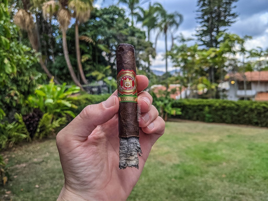 Este cigarro de nombre interminable comienza bastante bien, gracias a que tiene un tiro extraordinario, pero va muy en la misma onda de cigarros de capa madura que tienden ser muy reservados, sobre todo en las primeras caladas. Los sabores son de café y almendras, con una nota muy suave de pimienta; tan suave que puedo hacer retrogusto constantemente y apenas si confirmo las almendras. No hay mucho más que destacar en el primer tercio más allá de un anillo de combustión muy decente pero colores bastante sospechosos en la capa y en la imagen se nota perfectamente ese anillo de color más claro en la quemada, pero al menos la ceniza se sostiene bien y no hay necesidad de corrección.