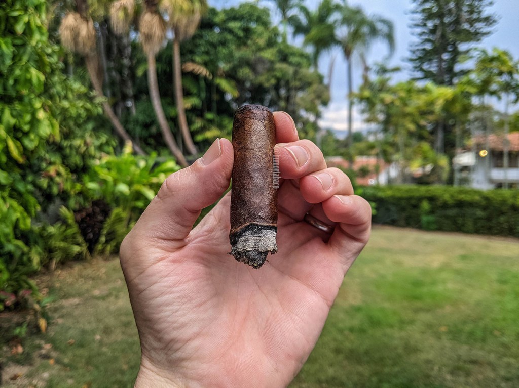 Para el último tercio no hay mayor cambio con respecto a los anteriores, pero sí pasa que tienden a simplificarse más hacia los sabores que aprecié en el primer tercio y a mostrar menos matices como aquellos que sentí en el segundo, por lo que los sabores son de café y maní, pero en el retrogusto se sienten notas más como de almendras, pero no del fruto seco sino más bien como de esencia o extracto de almendra. Aprovechando que tengo el tiempo, pues al rato que empecé a fumar comenzó a llover bastante duro y mi actividad en el jardín se vio comprometida, me dedico a fumar el cigarro hasta quemarme los dedos, lo cual tomó un total de dos horas y 10 minutos.