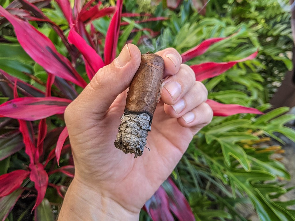 Ese sabor de tierra se vuelve a tierra mojada en el último tercio, lo que casualmente hace que el cigarro se sienta como más «mojado», o quizá es el hecho que le cuesta mantenerse encendido regularmente y eso afecta la quemada así como los sabores. Estos tienen a esa tierra mojada como principal, junto con la crema que ya había sentido y el café, pero incluye también una nota de pan tostado, cuero y la pimienta prácticamente desapareció. Al final, me toma una hora y cuarto llegar al final de este cigarro, que no quería terminar pues estaba en un ambiente muy agradable en casa de un amigo, pero ya él había terminado de fumar y estaba diciendo todo lo que tenía que hacer después. Tomé eso como indicación que debía buscar un nuevo destino.