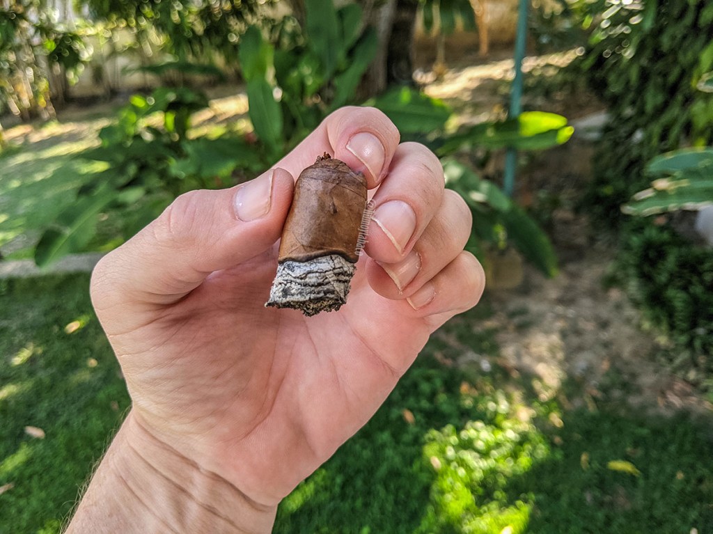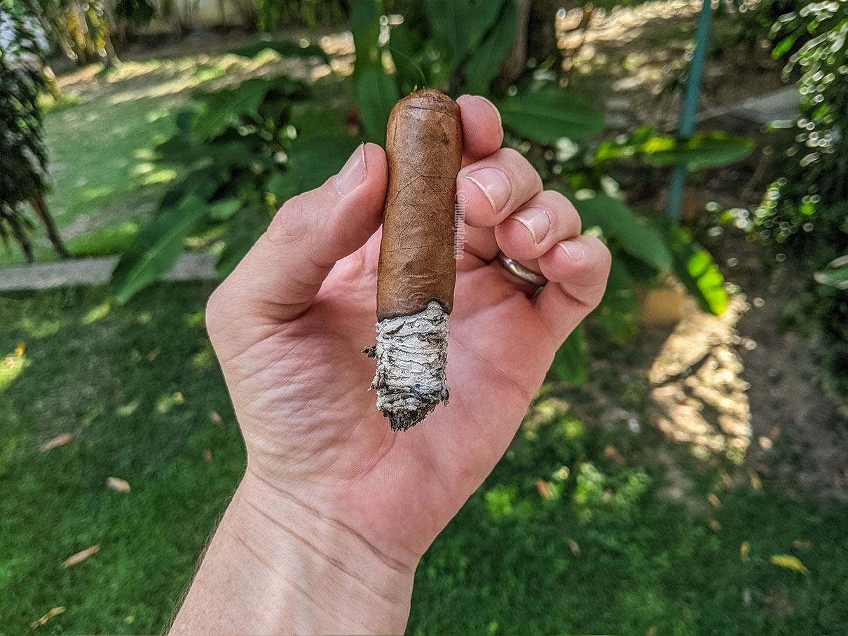 En el segundo tercio la pimienta sigue siendo el sabor dominante, pero está muy a la par y ligeramente por encima nada más de los sabores secundarios, que incluyen canela en este tercio pero también almendras, esta vez sin tostar y una sensación cremosa que se hace más notable a partir del punto medio del cigarro, justo en donde aparecen notas dulces más destacadas que se aproximan a caramelo. El segundo tercio también se caracteriza por una quemada mucho más lenta, quizá también porque la ausencia de anilla me hace perder un poco las dimensiones y no estar seguro en donde está la mitad, cosa que es bastante idiota de mi parte porque simplemente con ver el cigarro debería poder saber dónde empieza y donde termina, pero tal es la dependencia de estas cosas. El retrogusto sigue casi igual, con una marcada tendencia hacia la pimienta pero la inclusión de almendras también.