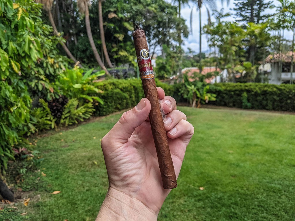 El Family Reserve Habano tiene una capa proveniente de Ecuador, mientras que el resto de las hojas son de origen nicaragüense, al igual que la fabricación del cigarro. La capa tiene múltiples venas y a simple vista pareciera ser más ancho en el pie que en la cabeza, pero realmente es un efecto de la foto, pues es bastante cilíndrico y uniforme, y también tiene un pequeño rabo’e cochino en la perilla. En la capa se aprecian notas bastante sutiles de cuero y chocolate, aunque este chocolate varía de intensidad a medida que me voy más hacia la parte de la cabeza del cigarro, mientras que prácticamente desaparece hacia el pie. Lo pico con la doble hojilla y antes de encenderlo con un simple fósforo a fin de no tostarlo demasiado, la calada en frío me da aromas a tierra y chocolate.