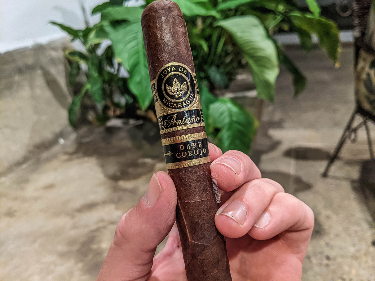 Joya de Nicaragua es la marca más antigua de ese país, al menos que todavía esté en funcionamiento, fundada en 1968. Mientras que el Antaño Dark Corojo es uno de sus productos más duraderos, habiendo sido lanzado en 2007 y desde entonces ha sido uno de los best-sellers. Pero la verdad es que tenía mucho tiempo con una imagen distinta a lo que el resto de los productos de JdN se estaba encaminando. Por ello, en 2017 decidieron crear una nueva imagen que vaya más en línea con la marca. El cigarro está disponible en seis vitolas, y el que voy a probar para la reseña se llama El Martillo. Su vitola se parece más a un robusto extra, con medidas 5,5×54. Luego de una semana bastante intensa en la que he estado fuera de casa muy regularmente, aprovecho para fumar en la terraza, aunque sea de noche.