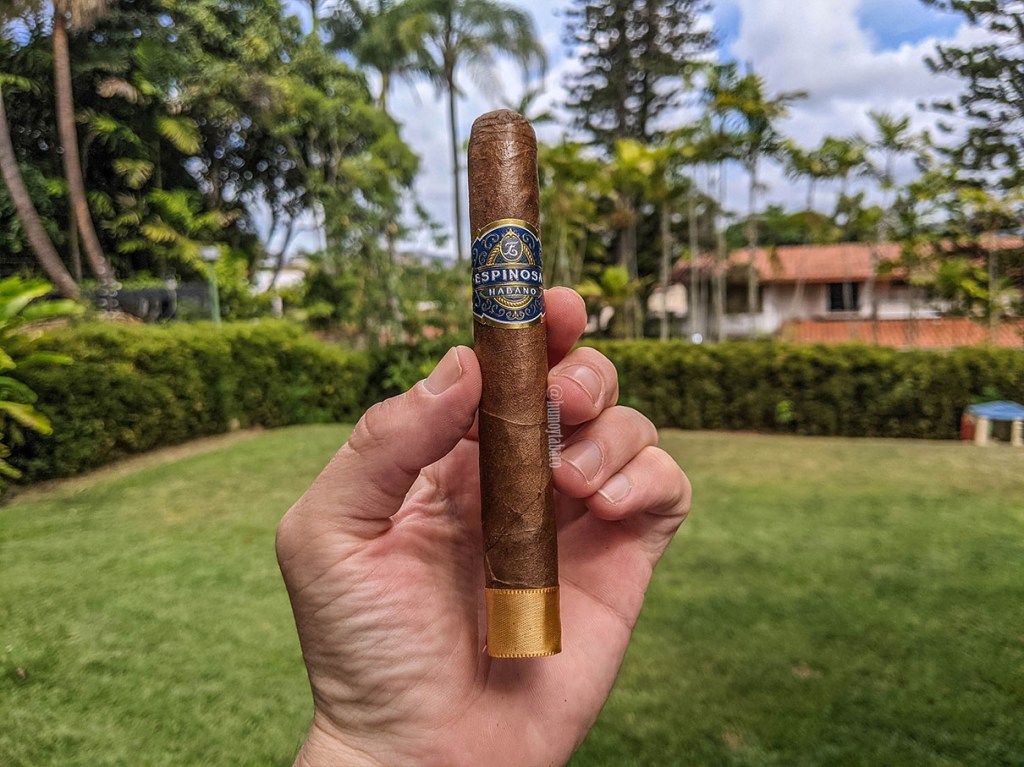 El Espinosa Habano fue originalmente lanzado en 2012 como parte de su lanzamiento de marca y como uno de los primeros productos de la fábrica La Zona de Nicaragua. Tres años después la liga del cigarro fue ligeramente rediseñada y en su versión No. 4 que es un poco más largo que un robusto se situó en el Top 25 de Cigar Aficionado para el año 2019. Un amigo mío llamado Roberto (@vwforever en Instagram) me lo obsequió hace un par de meses y semanalmente me recuerda que lo tengo y que espera que le devele mi experiencia con él, así que tuve que colocarlo entre los de fumada próxima y «colearlo» entre los primeros, porque si no, no para. El Habano tiene tripa y capote de Nicaragua bajo una capa Habano ecuatoriana y está disponible en cuatro vitolas, de las cuales dos son de cepos «pequeños» (50 y 52) a fin de destacar lo más posible esa capa.