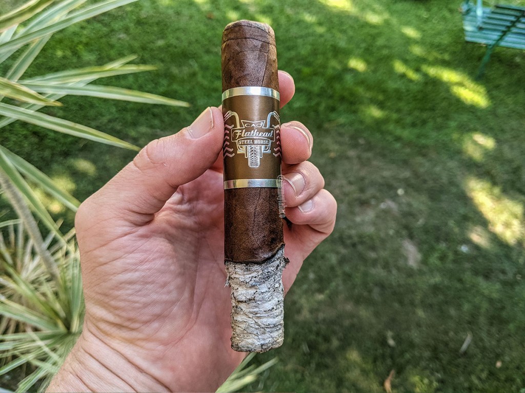 En 2013 CAO lanzó un cigarro diferente, inspirado en la mecánica automotriz y en los motores gigantes americanos. Esta línea se llamaría Flathead, por el motor que Ford y Harley Davidson hicieron famoso, aunque sus cajas siempre llevaron la versión del automóvil en sus motivos. Para 2015 quisieron llevar el concepto un paso más allá, haciendo cigarros con la cabeza plana, precisamente como su nombre en inglés lo indica, y lo llamaron el Flathead Steel Horse, el cual llevaría una liga casi completamente distinta al Flathead original e imágenes más relacionadas a las motos que a los carros. Este cigarro estaría disponible en solamente dos vitolas, una llamada Bullneck con dimensiones de 6,5 x 66 y otro llamado Apehanger, que es el que probé como parte del paquete de abril de Rumbullion Club.