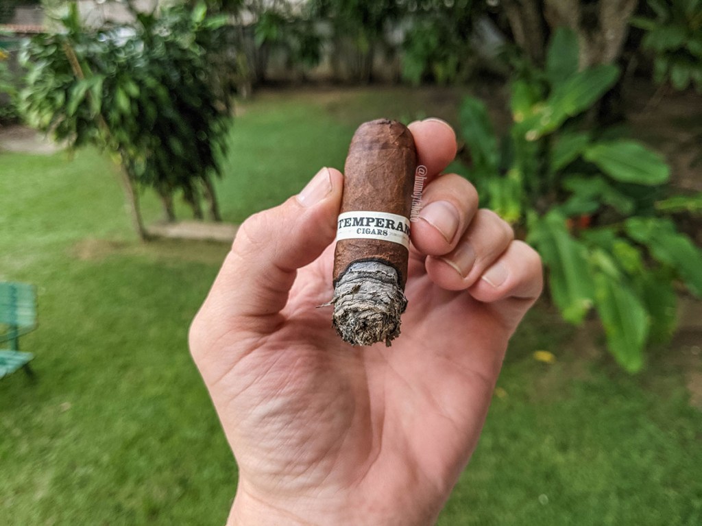El Intemperance BA XXI comienza muy bien, con humo abundante y denso, una ceniza compacta y bien armada, sabores frontales a madera seca y pimienta negra, mientras que en el retrogusto se siente es solamente pimienta. Para el final de este tercio los sabores se mantienen y quizá la madera se siente menos seca, mientras que en el retrogusto aparecen notas de esas frutas deshidratadas que aprecié en frío y también hay notas más suaves de nueces, que solo espero se agranden un poco más. El cigarro quema a buen ritmo y por un momento quisiera que quemara más lento porque está muy sabroso.