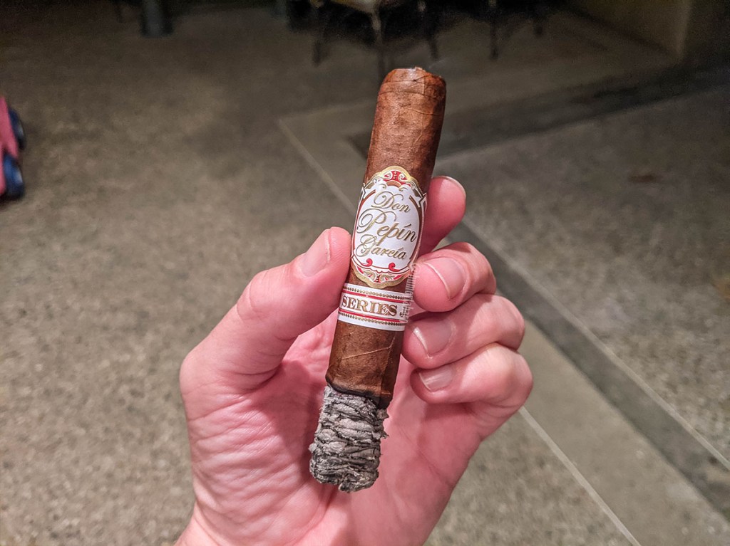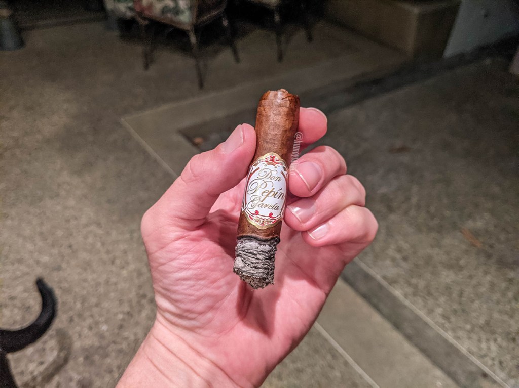 En el último tercio y gracias a la desaparición de las anillas, se aprecia mucho mejor la nota oleosa de la capa, que posiblemente también sea gracias al calor del encendido. Los sabores varían ligeramente, con la aparición de un sabor secundario a cuero, mientras que ese sabor sutil a carne 3/4 regresa en el último segmento, con la misma suavidad y casi imperceptibilidad de los tercios anteriores y dándole la misma nota más compleja a la fumada. Sigue quemando muy bien y el humo es abundante. Para ser un robusto en verdad fue una fumada placentera de una hora y 20 minutos, pero siendo de My Father no me impresiona que lo haya disfrutado tanto. Originalmente los compré para mi padrastro, pues él no fuma formatos más grandes que robusto extra (5×54) y esos le toman como dos horas y media, pero cada vez que fumamos en casa (una vez a la semana) me encuentro divagando sobre qué cigarro darle. Pero con lo bueno que este me pareció, no creo que sea un cigarro que quiera regalar.