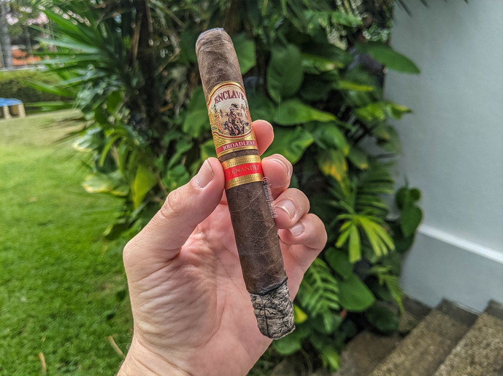 Pero el Enclave Broadleaf no es solo el mismo Enclave de siempre con una capa nueva, sino que es prácticamente otro cigarro, con un capote diferente, reemplazando el Camerún original con una hoja nicaragüense y una tripa nueva que ya no incluye la «selección de AJ Fernandez» sino contenido específico de Pueblo Nuevo, Estelí y Jalapa. Igualmente, el Enclave Broadleaf supera en más de $1 el precio del Enclave original. La capa es oscura, porque obviamente tiene mayor maduración, pero tiene más venas e imperfecciones que hacen que no sea lisa. Los aromas en esta capa son de tierra húmeda y chocolate, mientras que en el pie se sienten aromas de frutas dulces como durazno, madera y pimienta. Lo pico con la doble hojilla y hay aromas muy sutiles de durazno junto con paja y una sensación de hormigueo en los labios que puede ser por el sabor de pimienta.