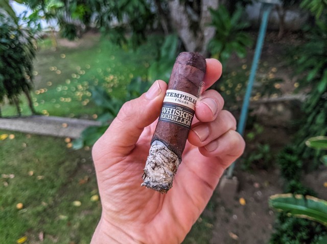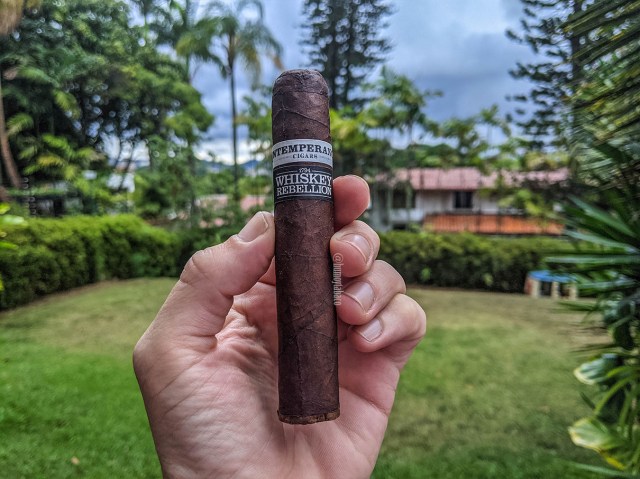 El Intemperance Whiskey Rebellion 1794 no es una edición limitada pero sí es de producción limitada, llegando a 500 cajas de 12 cigarros de cada vitola anual. El cigarro tiene una capa ecuatoriana Habano ligero sobre un capote Besuki de Indonesia y tripa de República Dominicana y Nicaragua. La capa es oscura, oleosa y brillante, pero viéndola en detalle, lo que brilla pareciera más como cristalización de los azúcares de la hoja, muy llamativo e interesante. La capa tiene aromas a nueces, mientras que en el pie ligeramente descubierto se aprecian aromas a pan, pimienta y beef jerky. La calada en frío presenta nuevamente ese aroma de pan, que es más parecido al aroma que sientes cuando abres una bolsa de pan cuadrado y no mucho más, salvo una sensación de pimienta.