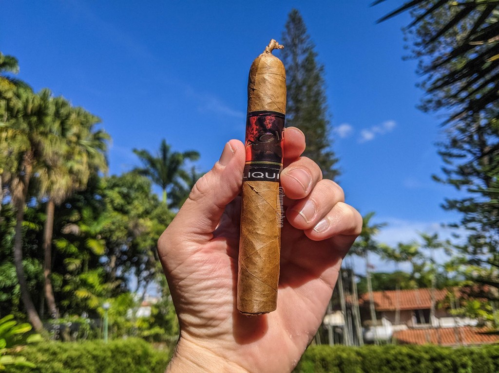 Aunque decido tomar la foto a contraluz porque pensé que saldría mejor, confieso que es lo único malo en esta imagen, pues el Liquid comienza con un tiro ligeramente apretado y eso es algo bastante positivo en la experiencia porque, aunque el cigarro tiene una capa Connecticut, la fumada es bastante fuerte y con humo denso y abundante, así que ese tiro ligeramente apretado me permite dosificar bien la fumada. Sin embargo, hay algunos sabores ácidos en la fumada que no me terminan de convencer, por lo que decido dejar el cigarro a un lado mientras anoto todos los sabores de este tercio. Definitivamente hay sabores de vino tinto, pero también tiene merey y una combinación de notas florales con incienso, que a lo mejor son la misma nota, pero no hay mucho en el retrogusto más allá de esa nota floral.
