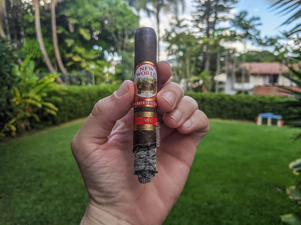 En las primeras caladas el New World Puro Especial realmente no tiene mucho de especial. A ver, es fuerte de pimienta y realmente siento que va a ser una buena fumada, pero a eso nos tiene acostumbrados la marca, por lo que no se siente diferente del resto de los increíbles cigarros de AJF. Pero el hecho es que los sabores son abundantes de pimienta y realmente es lo que más se siente, incluso sin hacer retrogusto. Los sabores además de la pimienta son bastante minerales, en donde prevalecen los sabores de tierra, arcilla y hasta grafito, o la parte interna de un lápiz. También hay notas cítricas, así que tampoco es tan lineal como la abundancia mineral te haría pensar, pero no tiene notas dulces ni las notas típicas de la marca como nueces o madera. En el aspecto técnico se comporta bastante bien, con un anillo de combustión bastante recto, humo abundante, aunque a ceniza no se aguanta mucho, pero con un cepo de 48, tampoco esperaba una columna sólida.
