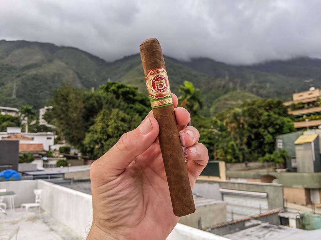 El día de hoy está bastante nublado y aunque la montaña se ve bien, en verdad es mucho más alta, pero hoy está cubierta por una densa nube. El Flor Fina 858 comienza con sabores ricos, humo abundante y una untuosidad en los sabores a madera y crema, con un retrogusto cremoso y cítrico que me invita a fumar lentamente para disfrutar lo más posible esta fumada que no creo que sea corta, pero planeo disfrutar lo más posible. A lo largo del primer tercio también aparecen notas de miel y pimienta, que se funden en esa nota cremosa de la fumada y mejoran la experiencia mucho más. El tiro está muy bien y el anillo de combustión también, mientras que la quemada lleva un excelente ritmo y me toma unos 35 minutos acabar con el primer tercio.