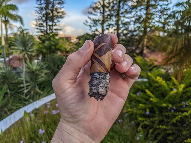 En el último tercio los sabores tienden a tomar un aspecto ligeramente más cremoso, sin presencia alguna de la pimienta, muy suave de chocolate y la intensidad fija en baja. Sin embargo, también suceden un par de cosas que no ayudan a la fumada. La primera es que a principios del último tercio aparece un sabor suave de caramelo que rápidamente se hace más y más tostado, hasta el punto que adquiere un sabor amargo el cigarro y al cabo de un rato ese sabor tan tostado y amargo se convierte en algo que solo puedo describir como plástico quemado. Este sabor desagradable y el hecho que el cigarro se va haciendo más suave da como resultado inmediato que no lo quiera fumar más, pero también que me quede con las ganas de fumar otro cigarro. No lo hice inmediatamente pues al final me tomó una hora y media para fumar el cigarro, pero en la noche sí me fumé uno, aunque pequeño.