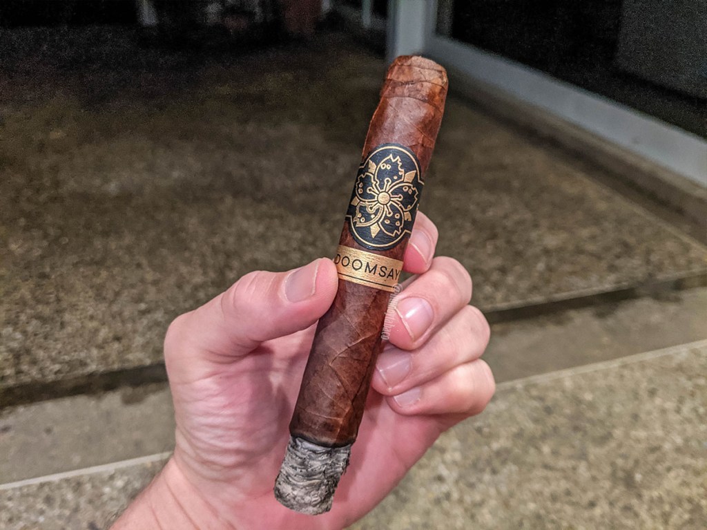 Las primeras caladas y durante gran parte del primer tercio el Doomsayer Aggressive es muy poco agresivo (por lo del nombre lo digo), el humo es escaso, casi que me pregunto varias veces si está bien encendido, pues es luego de varias caladas seguidas que comienza a producir una cantidad decente de humo, pero al mismo tiempo no quiero abusar y quemarlo demasiado así que trato de tomarlo con calma. También pasa que tiene poca pimienta, así que los entre eso, el humo escaso y el hecho que los sabores son muy sutiles, el cigarro no pinta muy bien. Los sabores son de madera y chocolate negro, pero siendo suaves no deslumbran y el retrogusto tiene una leve nota de pimienta pero no mucho más. En verdad cuesta dar descriptores adicionales para este tercio y el hecho que lo fumé de noche me hace pensar que no fue la mejor decisión.
